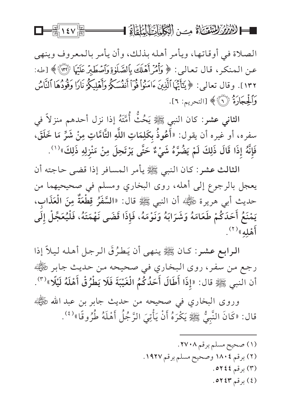 الرابع عشر: كان صلى اللهُ عليه وسلم ينهى أن يَطرُقَ الرجل أهله ليلاً إذا رجع من سفر، روى البخاري في صحيحه من حديث جابر رضي اللهُ عنه أن النبي صلى اللهُ عليه وسلم قال: «إِذَا أَطَالَ أَحَدُكُمُ الْغَيْبَةَ فَلَا يَطْرُقْ أَهْلَهُ لَيْلًا» (¬٣).