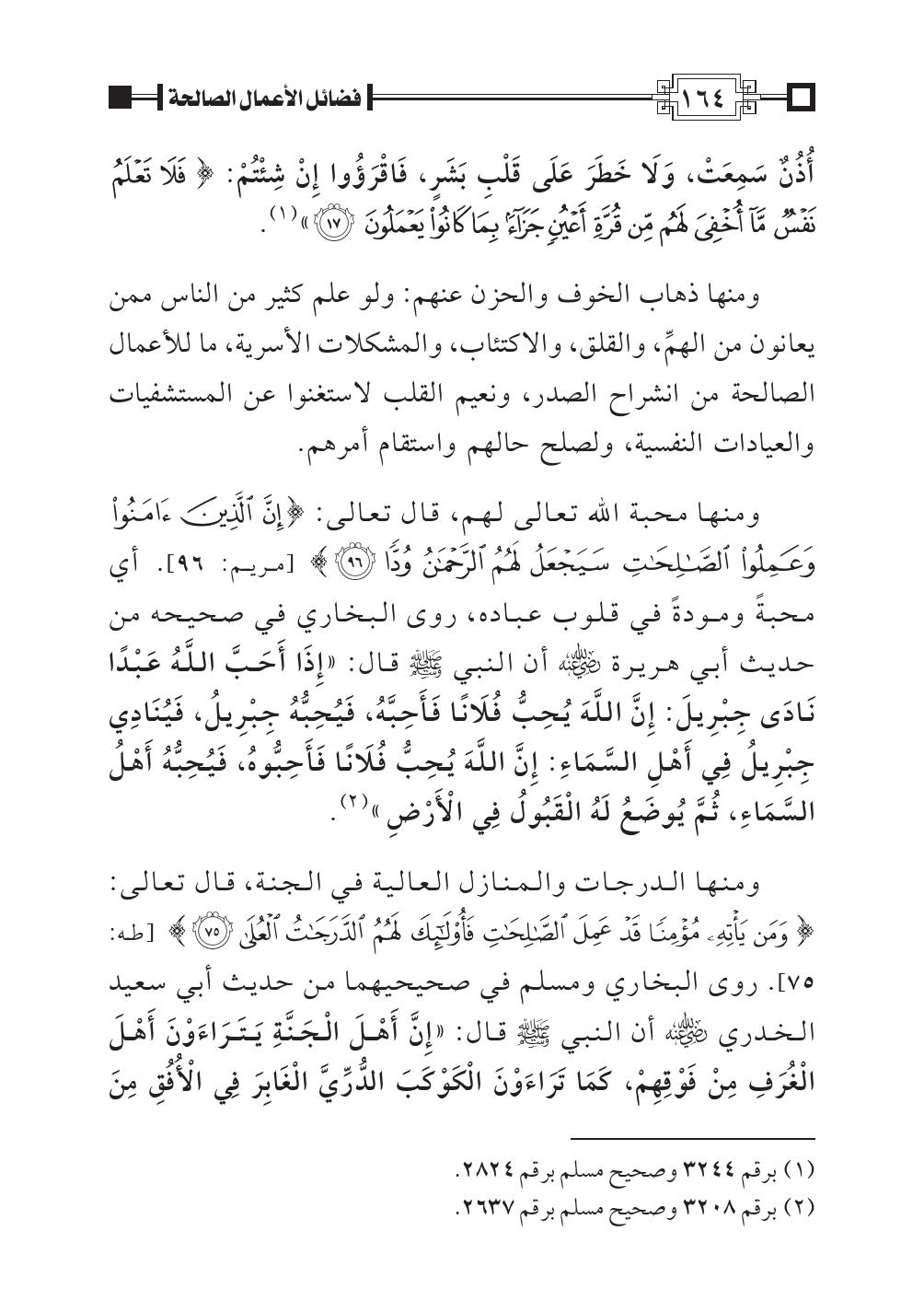 ومنها الدرجات والمنازل العالية في الجنة، قال تعالى: {وَمَنْ يَاتِهِ مُؤْمِنًا قَدْ عَمِلَ الصَّالِحَاتِ فَأُوْلَئِكَ لَهُمُ الدَّرَجَاتُ الْعُلَى (٧٥)} [طه: ٧٥]. روى البخاري ومسلم في صحيحيهما من حديث أبي سعيد الخدري رضي اللهُ عنه أن النبي صلى اللهُ عليه وسلم قال: «إِنَّ أَهْلَ الْجَنَّةِ يَتَرَاءَوْنَ أَهْلَ الْغُرَفِ مِنْ فَوْقِهِمْ، كَمَا تَرَاءَوْنَ الْكَوْكَبَ الدُّرِّيَّ الْغَابِرَ فِي الْأُفُقِ مِنَ
