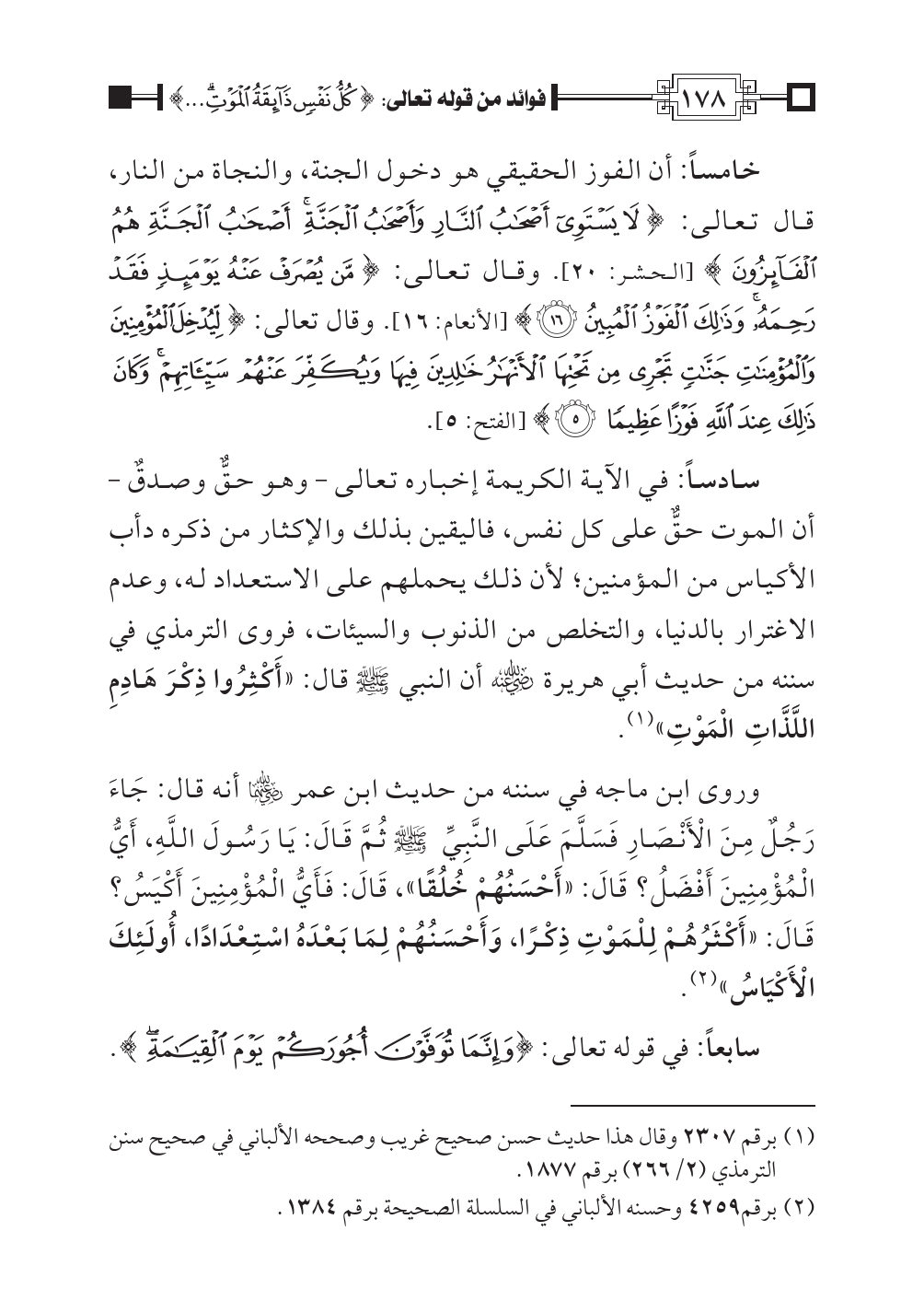 سادساً: في الآية الكريمة إخباره تعالى - وهو حقٌّ وصدقٌ - أن الموت حقٌّ على كل نفس، فاليقين بذلك والإكثار من ذكره دأب الأكياس من المؤمنين؛ لأن ذلك يحملهم على الاستعداد له، وعدم الاغترار بالدنيا، والتخلص من الذنوب والسيئات، فروى الترمذي في سننه من حديث أبي هريرة رضي اللهُ عنه أن النبي صلى اللهُ عليه وسلم قال: «أَكْثِرُوا ذِكْرَ هَادِمِ اللَّذَّاتِ الْمَوْتِ» (¬١).