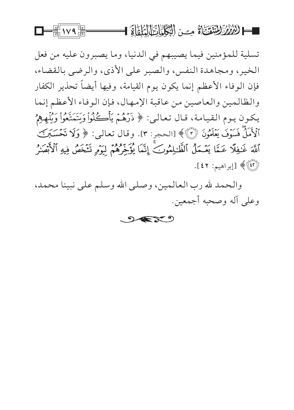 تسلية للمؤمنين فيما يصيبهم في الدنيا، وما يصبرون عليه من فعل الخير، ومجاهدة النفس، والصبر على الأذى، والرضى بالقضاء، فإن الوفاء الأعظم إنما يكون يوم القيامة، وفيها أيضاً تحذير الكفار والظالمين والعاصين من عاقبة الإمهال، فإن الوفاء الأعظم إنما يكون يوم القيامة، قال تعالى: {ذَرْهُمْ يَاكُلُوا وَيَتَمَتَّعُوا وَيُلْهِهِمُ الأَمَلُ فَسَوْفَ يَعْلَمُون (٣)} [الحجر: ٣]. وقال تعالى: {وَلَا تَحْسَبَنَّ اللهَ غَافِلاً عَمَّا يَعْمَلُ الظَّالِمُونَ إِنَّمَا يُؤَخِّرُهُمْ لِيَوْمٍ تَشْخَصُ فِيهِ الأَبْصَار (٤٣)} [إبراهيم: ٤٢].