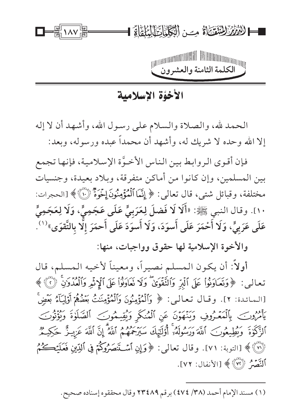 الكلمة الثامنة والعشرون: الأخوَّة الإسلامية