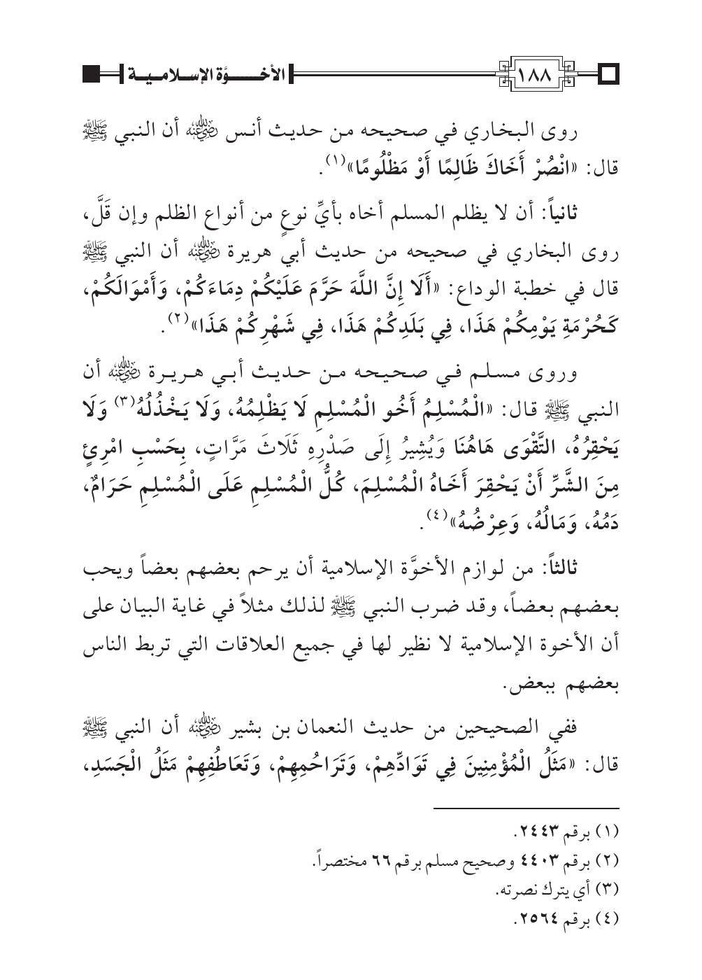 ثالثاً: من لوازم الأخوَّة الإسلامية أن يرحم بعضهم بعضاً ويحب بعضهم بعضاً، وقد ضرب النبي صلى اللهُ عليه وسلم لذلك مثلاً في غاية البيان على أن الأخوة الإسلامية لا نظير لها في جميع العلاقات التي تربط الناس بعضهم ببعض.