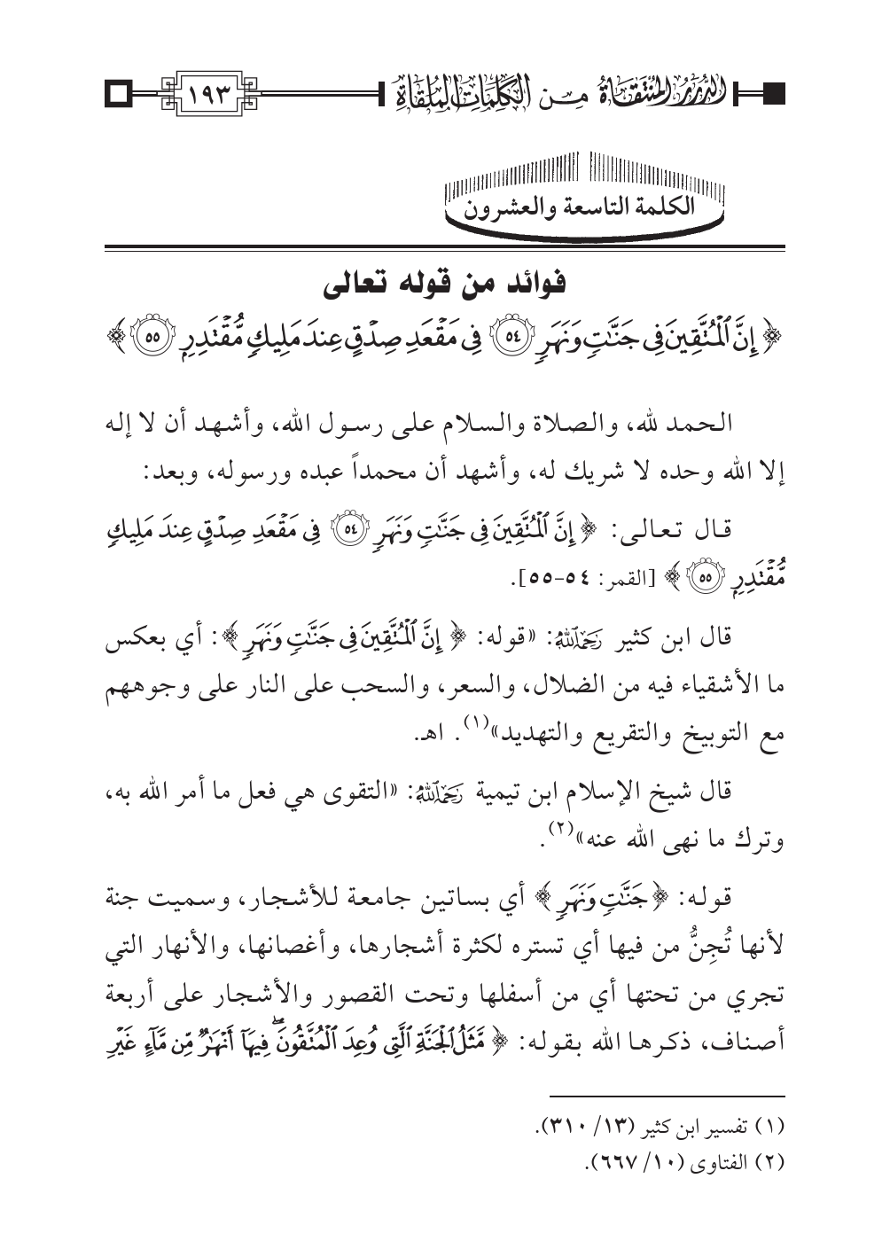 الكلمة التاسعة والعشرون: فوائد من قوله تعالى {إِنَّ الْمُتَّقِينَ فِي جَنَّاتٍ وَنَهَر * فِي مَقْعَدِ صِدْقٍ عِندَ مَلِيكٍ مُّقْتَدِر}