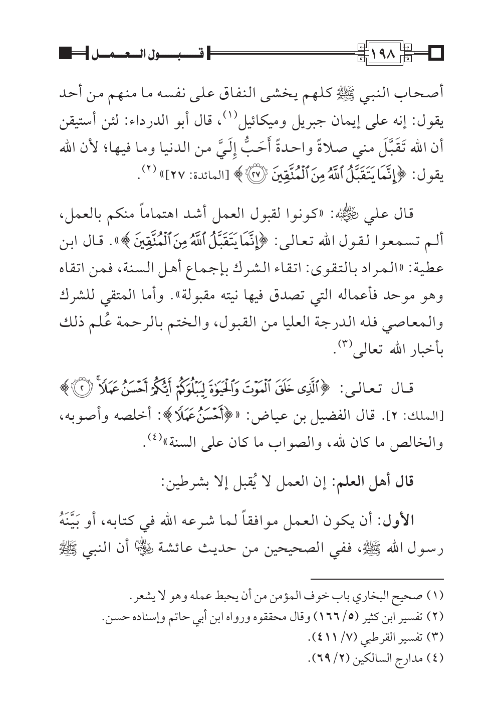 قال تعالى: {الَّذِي خَلَقَ الْمَوْتَ وَالْحَيَاةَ لِيَبْلُوَكُمْ أَيُّكُمْ أَحْسَنُ عَمَلاً} [الملك: ٢]. قال الفضيل بن عياض: «{أَحْسَنُ عَمَلاً}: أخلصه وأصوبه، والخالص ما كان لله، والصواب ما كان على السنة» (¬٤).