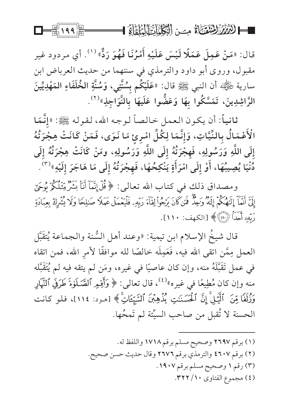 قال: «مَنْ عَمِلَ عَمَلًا لَيْسَ عَلَيْهِ أَمْرُنَا فَهُوَ رَدٌّ» (¬١). أي مردود غير مقبول، وروى أبو داود والترمذي في سننهما من حديث العرباض ابن سارية رضي اللهُ عنه أن النبي صلى اللهُ عليه وسلم قال: «عَلَيْكُم بِسُنَّتِي، وَسُنَّةِ الخُلَفَاءِ المَهْدِيِّينَ الرَّاشِدِينَ، تَمَسَّكُوا بِهَا وَعَضُّوا عَلَيهَا بِالنَّوَاجِذِ» (¬٢).