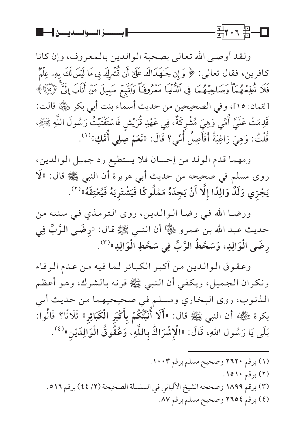 وعقوق الوالدين من أكبر الكبائر لما فيه من عدم الوفاء ونكران الجميل، ويكفي أن النبي صلى اللهُ عليه وسلم قرنه بالشرك، وهو أعظم الذنوب، روى البخاري ومسلم في صحيحيهما من حديث أبي بكرة رضي اللهُ عنه أن النبي صلى اللهُ عليه وسلم قال: «أَلَا أُنَبِّئُكُمْ بِأَكْبَرِ الْكَبَائِرِ» ثَلَاثًا؟ قَالُوا: بَلَى يَا رَسُول اللهِ، قَالَ: «الْإِشْرَاكُ بِاللَّهِ، وَعُقُوقُ الْوَالِدَيْنِ» (¬٤).