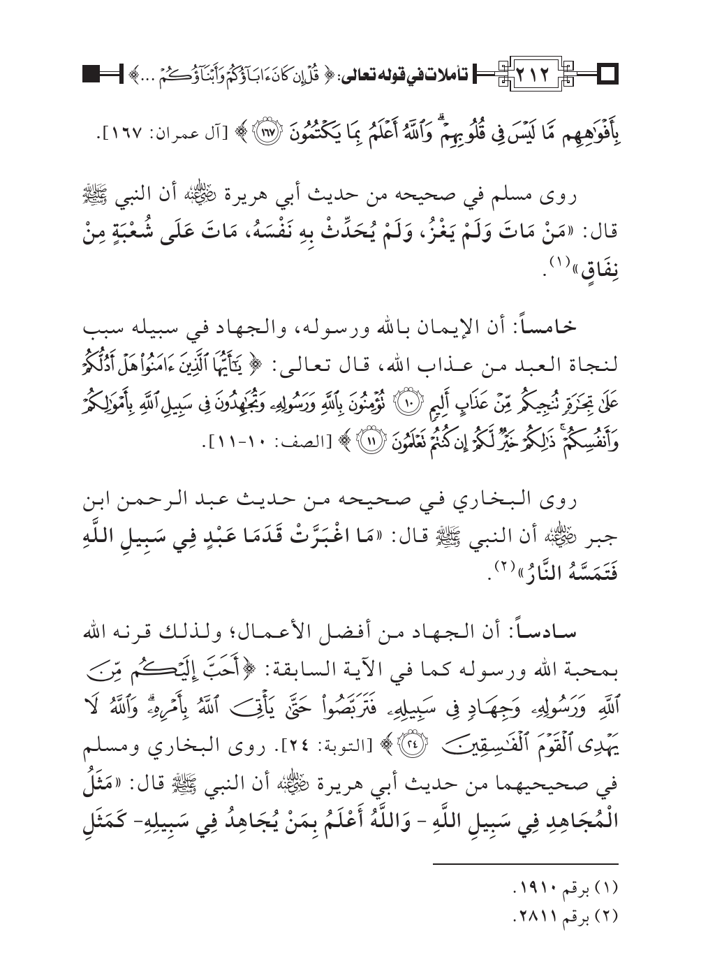 سادساً: أن الجهاد من أفضل الأعمال؛ ولذلك قرنه الله بمحبة الله ورسوله كما في الآية السابقة: {قُلْ إِن كَانَ آبَاؤُكُمْ وَأَبْنَآؤُكُمْ وَإِخْوَانُكُمْ وَأَزْوَاجُكُمْ وَعَشِيرَتُكُمْ وَأَمْوَالٌ اقْتَرَفْتُمُوهَا وَتِجَارَةٌ تَخْشَوْنَ كَسَادَهَا وَمَسَاكِنُ تَرْضَوْنَهَا أَحَبَّ إِلَيْكُم مِّنَ اللهِ وَرَسُولِهِ وَجِهَادٍ فِي سَبِيلِهِ فَتَرَبَّصُوا حَتَّى يَاتِيَ اللهُ بِأَمْرِهِ وَاللهُ لَا يَهْدِي الْقَوْمَ الْفَاسِقِين (٢٤)} [التوبة: ٢٤]. روى البخاري ومسلم في صحيحيهما من حديث أبي هريرة رضي اللهُ عنه أن النبي صلى اللهُ عليه وسلم قال: «مَثَلُ الْمُجَاهِدِ فِي سَبِيلِ اللَّهِ - وَاللَّهُ أَعْلَمُ بِمَنْ يُجَاهِدُ فِي سَبِيلِهِ - كَمَثَلِ