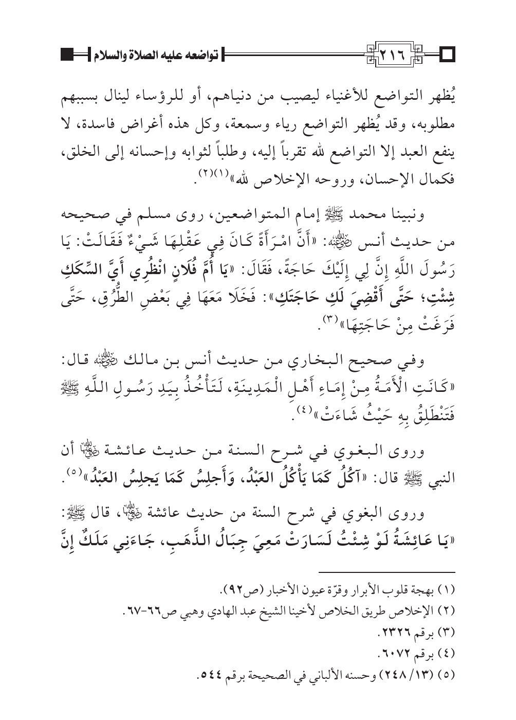 ونبينا محمد صلى اللهُ عليه وسلم إمام المتواضعين، روى مسلم في صحيحه من حديث أنس رضي اللهُ عنه: «أَنَّ امْرَأَةً كَانَ فِي عَقْلِهَا شَيْءٌ فَقَالَتْ: يَا رَسُولَ اللَّهِ إِنَّ لِي إِلَيْكَ حَاجَةً، فَقَالَ: «يَا أُمَّ فُلَانٍ انْظُرِي أَيَّ السِّكَكِ شِئْتِ؛ حَتَّى أَقْضِيَ لَكِ حَاجَتَكِ»: فَخَلَا مَعَهَا فِي بَعْضِ الطُّرُقِ، حَتَّى فَرَغَتْ مِنْ حَاجَتِهَا» (¬٣).