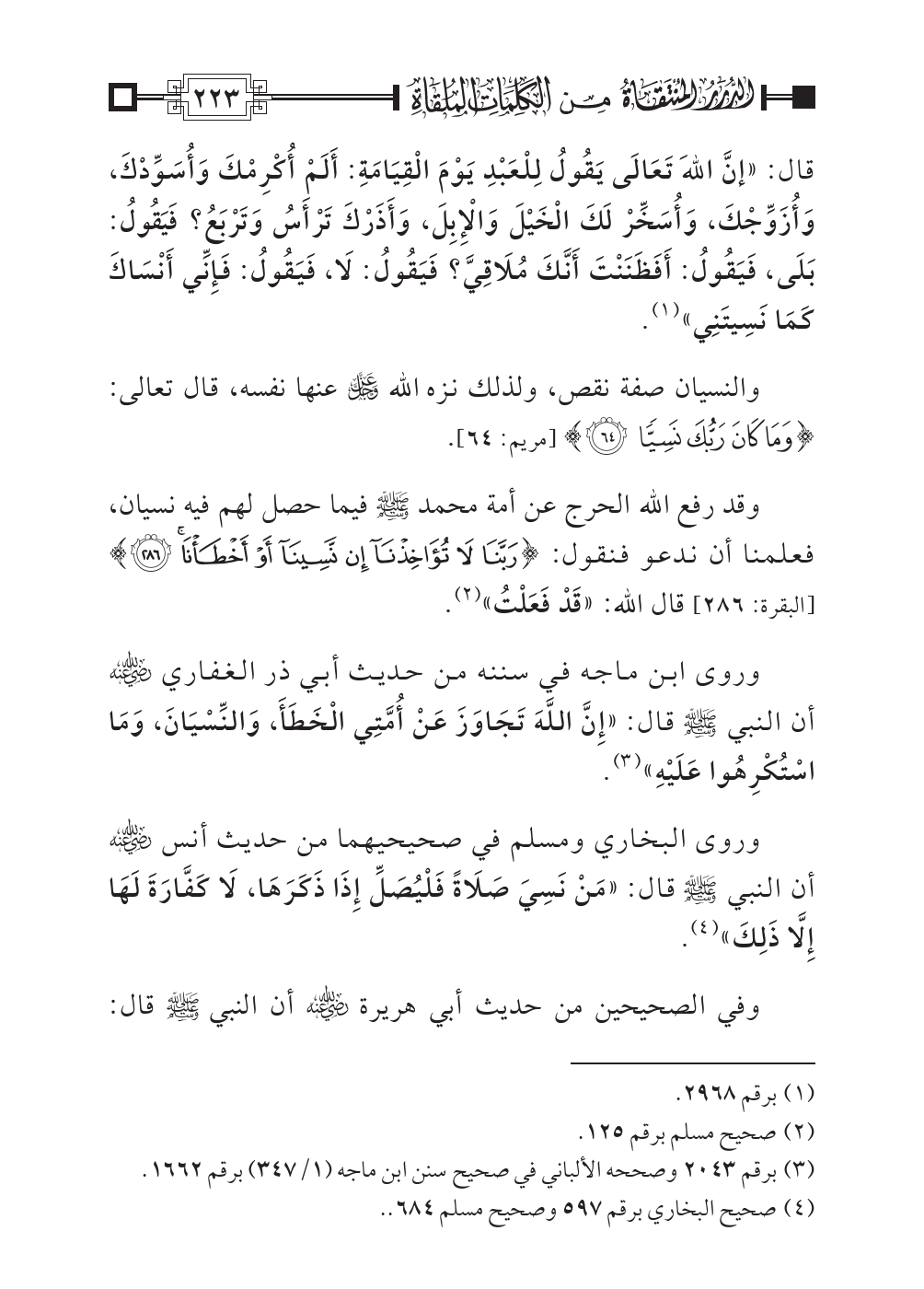 وقد رفع الله الحرج عن أمة محمد صلى اللهُ عليه وسلم فيما حصل لهم فيه نسيان، فعلمنا أن ندعو فنقول: {رَبَّنَا لَا تُؤَاخِذْنَا إِن نَّسِينَا أَوْ أَخْطَانَا} [البقرة: ٢٨٦] قال الله: «قَدْ فَعَلْتُ» (¬٢).