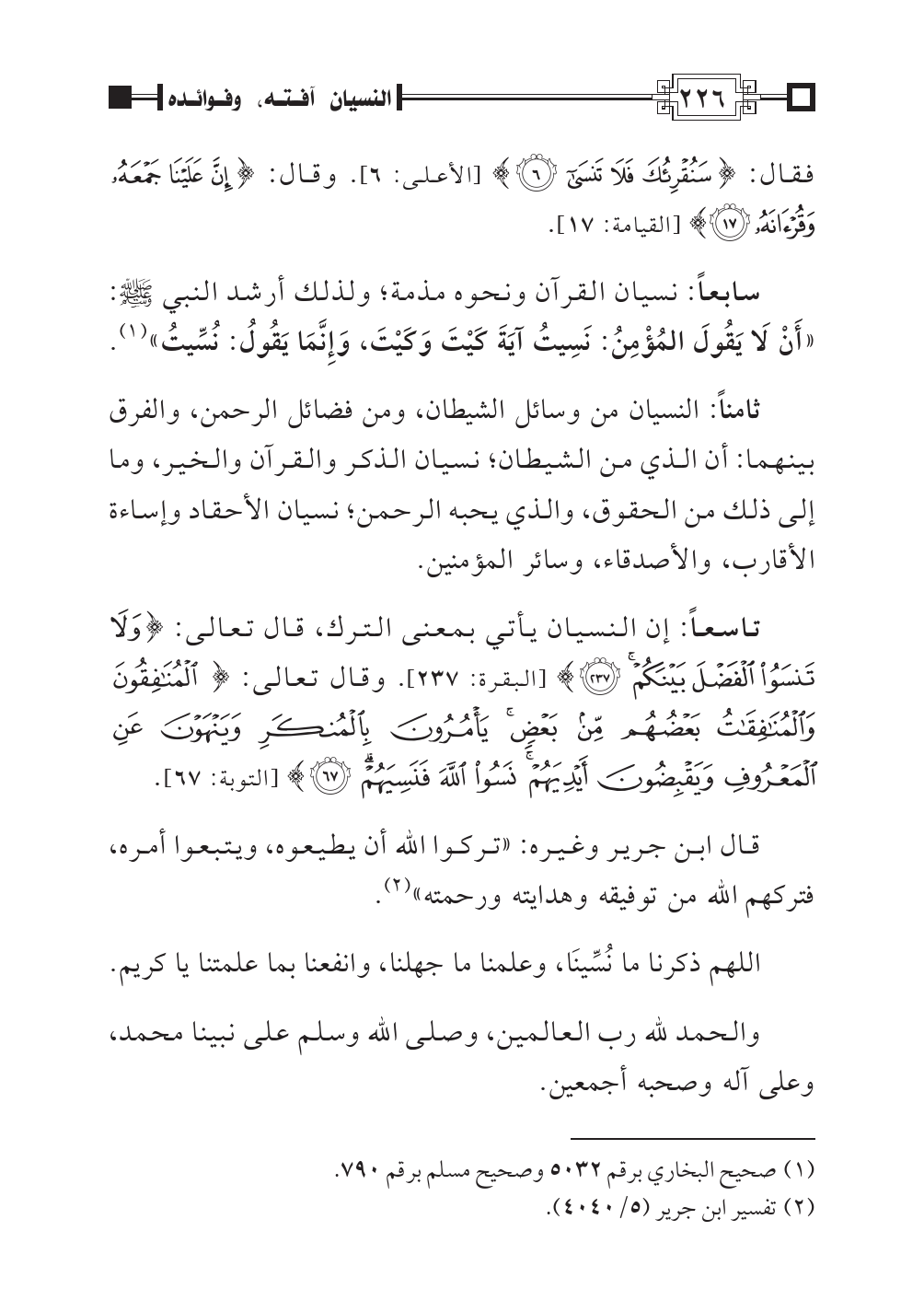 سابعاً: نسيان القرآن ونحوه مذمة؛ ولذلك أرشد النبي صلى اللهُ عليه وسلم: «أَنْ لَا يَقُولَ المُؤْمِنُ: نَسِيتُ آيَةَ كَيْتَ وَكَيْتَ، وَإِنَّمَا يَقُولُ: نُسِّيتُ» (¬١).