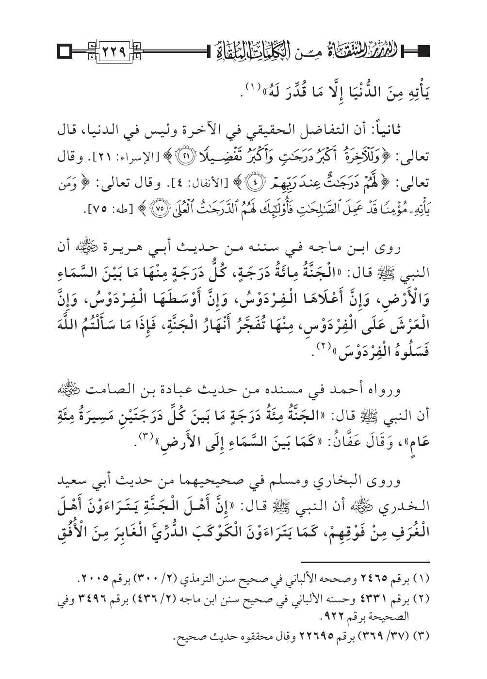 ثانياً: أن التفاضل الحقيقي في الآخرة وليس في الدنيا، قال تعالى: {وَلَلآخِرَةُ أَكْبَرُ دَرَجَاتٍ وَأَكْبَرُ تَفْضِيلا} [الإسراء: ٢١]. وقال تعالى: {لَّهُمْ دَرَجَاتٌ عِندَ رَبِّهِمْ} [الأنفال: ٤]. وقال تعالى: {وَمَنْ يَاتِهِ مُؤْمِنًا قَدْ عَمِلَ الصَّالِحَاتِ فَأُوْلَئِكَ لَهُمُ الدَّرَجَاتُ الْعُلَى (٧٥)} [طه: ٧٥].