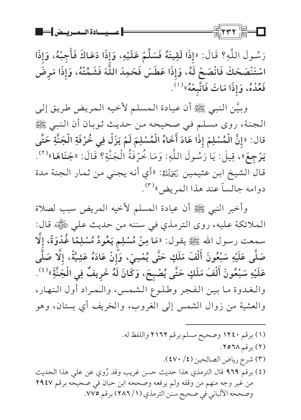 وبيَّن النبي صلى اللهُ عليه وسلم أن عيادة المسلم لأخيه المريض طريق إلى الجنة، روى مسلم في صحيحه من حديث ثوبان أن النبي صلى اللهُ عليه وسلم قال: «إِنَّ الْمُسْلِمَ إِذَا عَادَ أَخَاهُ الْمُسْلِمَ لَمْ يَزَلْ فِي خُرْفَةِ الْجَنَّةِ حَتَّى يَرْجِعَ»، قِيلَ: يَا رَسُولَ اللَّهِ: وَمَا خُرْفَةُ الْجَنَّةِ؟ قَالَ: «جَنَاهَا» (¬٢). قال الشيخ ابن عثيمين رحمه الله: «أي أنه يجني من ثمار الجنة مدة دوامه جالساً عند هذا المريض» (¬٣).