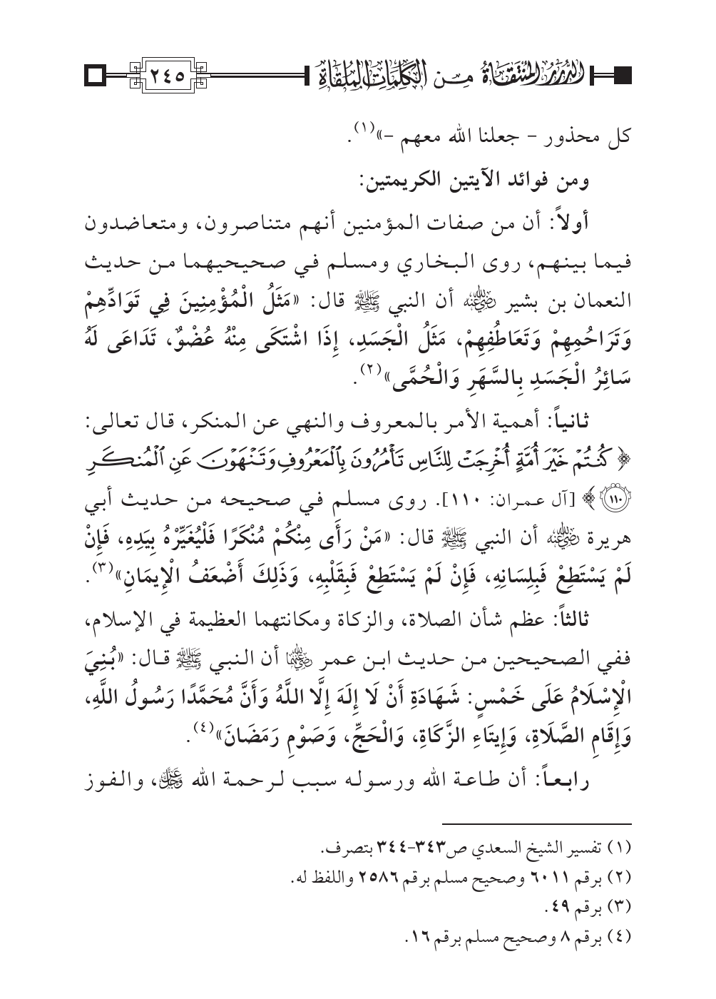 ثانياً: أهمية الأمر بالمعروف والنهي عن المنكر، قال تعالى: {كُنتُمْ خَيْرَ أُمَّةٍ أُخْرِجَتْ لِلنَّاسِ تَامُرُونَ بِالْمَعْرُوفِ وَتَنْهَوْنَ عَنِ الْمُنكَرِ} [آل عمران: ١١٠]. روى مسلم في صحيحه من حديث أبي هريرة رضي اللهُ عنه أن النبي صلى اللهُ عليه وسلم قال: «مَنْ رَأَى مِنْكُمْ مُنْكَرًا فَلْيُغَيِّرْهُ بِيَدِهِ، فَإِنْ لَمْ يَسْتَطِعْ فَبِلِسَانِهِ، فَإِنْ لَمْ يَسْتَطِعْ فَبِقَلْبِهِ، وَذَلِكَ أَضْعَفُ الْإِيمَانِ» (¬٣).