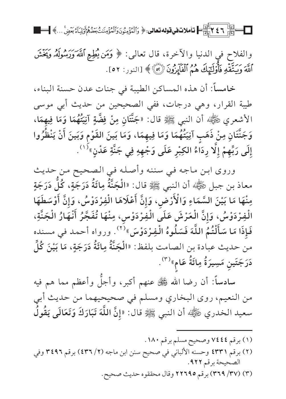 خامساً: أن هذه المساكن الطيبة في جنات عدن حسنة البناء، طيبة القرار، وهي درجات، ففي الصحيحين من حديث أبي موسى الأشعري رضي اللهُ عنه أن النبي صلى اللهُ عليه وسلم قال: «جَنَّتَانِ مِنْ فِضَّةٍ آنِيَتُهُمَا وَمَا فِيهِمَا، وَجَنَّتَانِ مِنْ ذَهَبٍ آنِيَتُهُمَا وَمَا فِيهِمَا، وَمَا بَينَ القَوْمِ وَبَينَ أَنْ يَنْظُرُوا إِلَى رَبِّهِمْ إِلَّا رِدَاءُ الكِبْرِ عَلَى وَجْهِهِ فِي جَنَّةِ عَدْنٍ» (¬١).