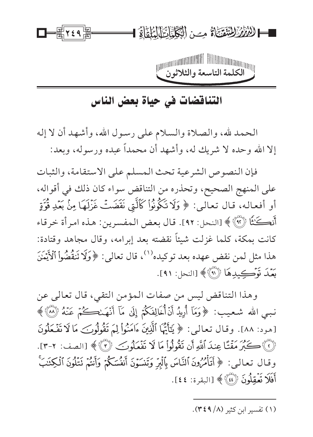 فإن النصوص الشرعية تحث المسلم على الاستقامة، والثبات على المنهج الصحيح، وتحذره من التناقض سواء كان ذلك في أقواله، أو أفعاله، قال تعالى: {وَلَا تَكُونُوا كَالَّتِي نَقَضَتْ غَزْلَهَا مِن بَعْدِ قُوَّةٍ أَنكَاثًا} [النحل: ٩٢]. قال بعض المفسرين: هذه امرأة خرقاء كانت بمكة، كلما غزلت شيئاً نقضته بعد إبرامه، وقال مجاهد وقتادة: هذا مثل لمن نقض عهده بعد توكيده (¬١)، قال تعالى: {وَلَا تَنقُضُوا الأَيْمَانَ بَعْدَ تَوْكِيدِهَا} [النحل: ٩١].