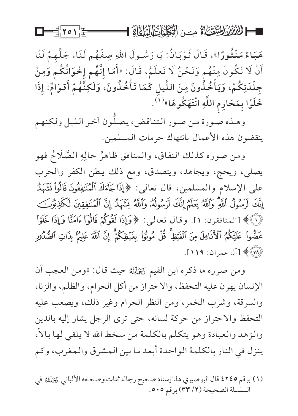 هَبَاءً مَنْثُورًا»، قَالَ ثَوْبَانُ: يَا رَسُولَ اللهِ صِفْهُم لَنَا، جَلِّهِمْ لَنَا أَنْ لَا نَكُونَ مِنْهُم وَنَحْنُ لَا نَعلَمُ، قَالَ: «أَمَا إِنَّهُم إِخْوَانُكُم وَمِنْ جِلْدَتِكُمْ، وَيَاخُذُونَ مِنَ اللَّيلِ كَمَا تَاخُذُونَ، وَلَكِنَّهُمْ أَقوَامٌ: إِذَا خَلَوْا بِمَحَارِمِ اللَّهِ انْتَهَكُوهَا» (¬١).