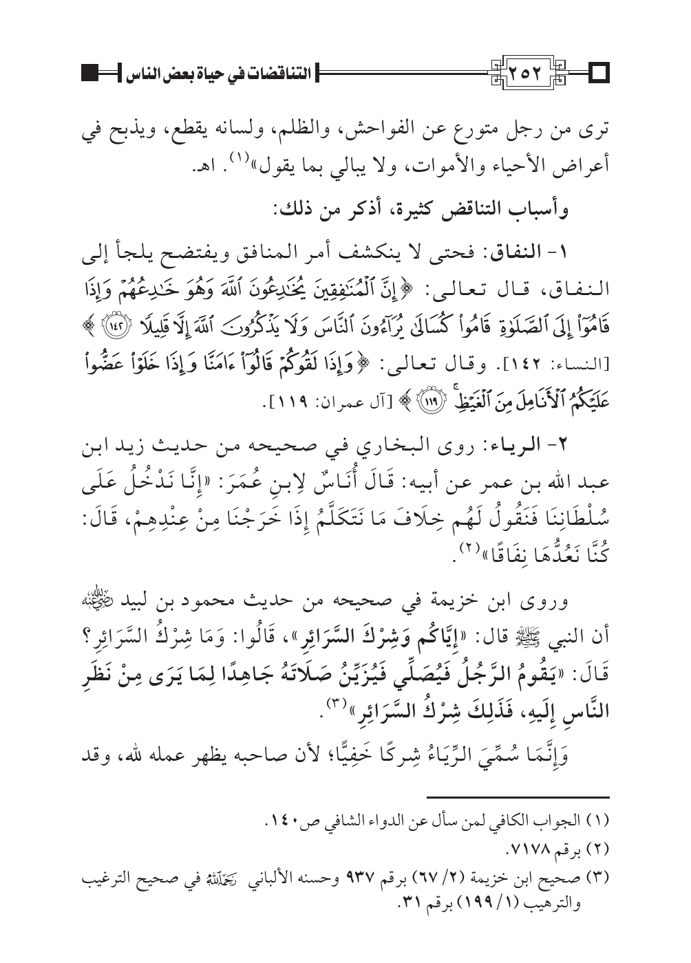 ٢ - الرياء: روى البخاري في صحيحه من حديث زيد ابن عبد الله بن عمر عن أبيه: قَالَ أُنَاسٌ لِابنِ عُمَرَ: «إِنَّا نَدْخُلُ عَلَى سُلْطَانِنَا فَنَقُولُ لَهُم خِلَافَ مَا نَتَكَلَّمُ إِذَا خَرَجْنَا مِنْ عِنْدِهِمْ، قَالَ: كُنَّا نَعُدُّهَا نِفَاقًا» (¬٢).