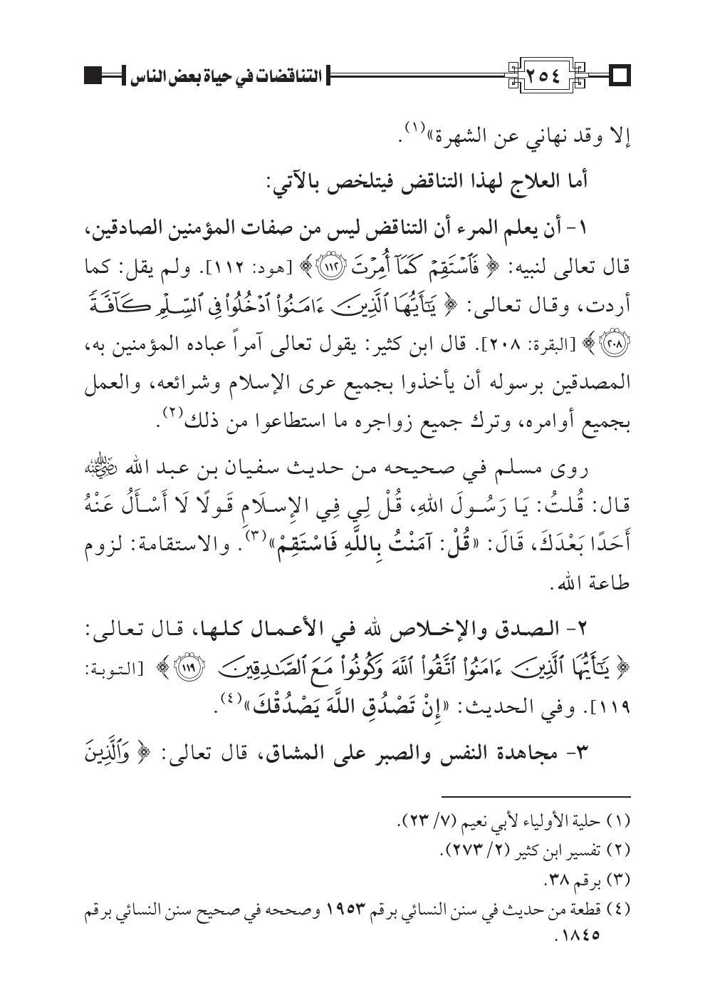 ١ - أن يعلم المرء أن التناقض ليس من صفات المؤمنين الصادقين، قال تعالى لنبيه: {فَاسْتَقِمْ كَمَا أُمِرْتَ} [هود: ١١٢]. ولم يقل: كما أردت، وقال تعالى: {يَاأَيُّهَا الَّذِينَ آمَنُوا ادْخُلُوا فِي السِّلْمِ كَآفَّةً} [البقرة: ٢٠٨]. قال ابن كثير: يقول تعالى آمراً عباده المؤمنين به، المصدقين برسوله أن يأخذوا بجميع عرى الإسلام وشرائعه، والعمل بجميع أوامره، وترك جميع زواجره ما استطاعوا من ذلك (¬٢).