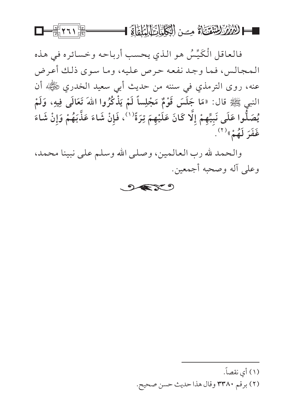 فالعاقل الْكَيِّسُ هو الذي يحسب أرباحه وخسائره في هذه المجالس، فما وجد نفعه حرص عليه، وما سوى ذلك أعرض عنه، روى الترمذي في سننه من حديث أبي سعيد الخدري رضي اللهُ عنه أن النبي صلى اللهُ عليه وسلم قال: «مَا جَلَسَ قَوْمٌ مَجْلِساً لَمْ يَذْكُرُوا اللهَ تَعَالَى فِيهِ، وَلَمْ يُصَلُّوا عَلَى نَبِيِّهِمْ إِلَّا كَانَ عَلَيْهِمَ تِرَةً (¬١)، فَإِنْ شَاءَ عَذَّبَهُمْ وَإِنْ شَاءَ غَفَرَ لَهُمْ» (¬٢).