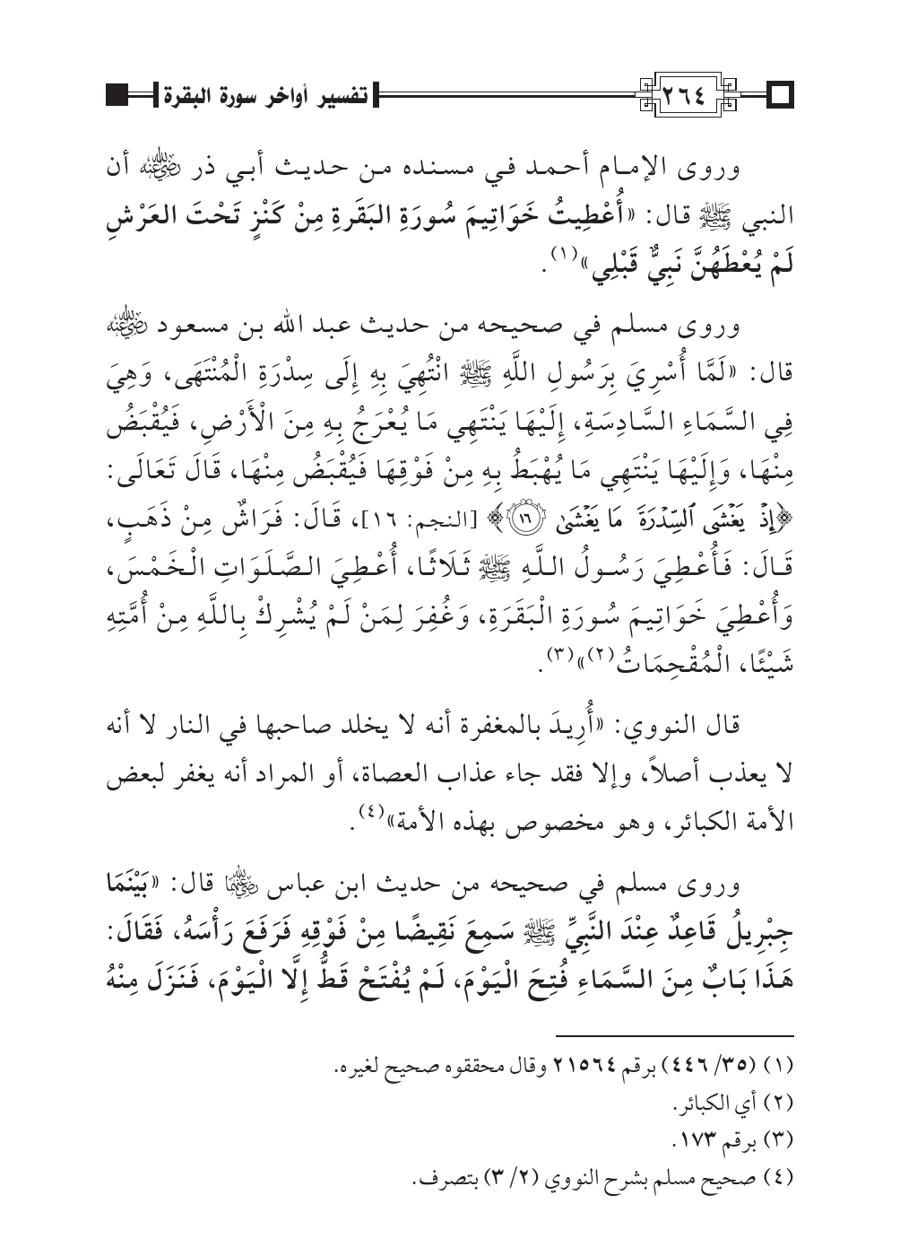 وروى مسلم في صحيحه من حديث عبد الله بن مسعود رضي اللهُ عنه قال: «لَمَّا أُسْرِيَ بِرَسُولِ اللَّهِ صلى اللهُ عليه وسلم انْتُهِيَ بِهِ إِلَى سِدْرَةِ الْمُنْتَهَى، وَهِيَ فِي السَّمَاءِ السَّادِسَةِ، إِلَيْهَا يَنْتَهِي مَا يُعْرَجُ بِهِ مِنَ الْأَرْضِ، فَيُقْبَضُ مِنْهَا، وَإِلَيْهَا يَنْتَهِي مَا يُهْبَطُ بِهِ مِنْ فَوْقِهَا فَيُقْبَضُ مِنْهَا، قَالَ تَعَالَى: {إِذْ يَغْشَى السِّدْرَةَ مَا يَغْشَى (١٦)} [النجم: ١٦]، قَالَ: فَرَاشٌ مِنْ ذَهَبٍ، قَالَ: فَأُعْطِيَ رَسُولُ اللَّهِ صلى اللهُ عليه وسلم ثَلَاثًا، أُعْطِيَ الصَّلَوَاتِ الْخَمْسَ، وَأُعْطِيَ خَوَاتِيمَ سُورَةِ الْبَقَرَةِ، وَغُفِرَ لِمَنْ لَمْ يُشْرِكْ بِاللَّهِ مِنْ أُمَّتِهِ شَيْئًا، الْمُقْحِمَاتُ (¬٢)» (¬٣).