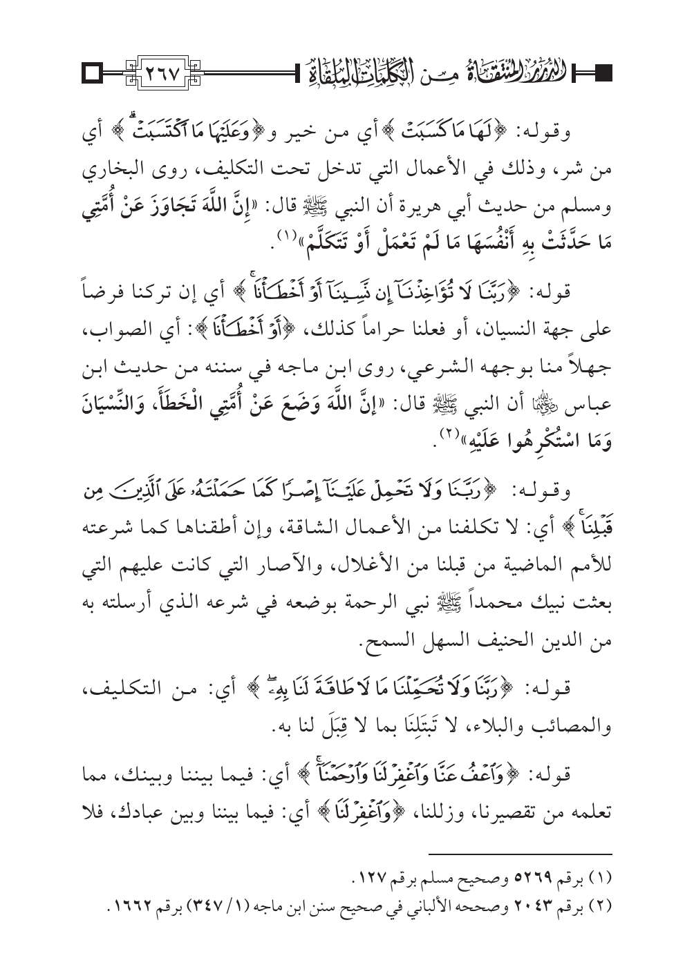 قوله: {رَبَّنَا لَا تُؤَاخِذْنَا إِن نَّسِينَا أَوْ أَخْطَانَا} أي إن تركنا فرضاً على جهة النسيان، أو فعلنا حراماً كذلك، {أَخْطَانَا}: أي الصواب، جهلاً منا بوجهه الشرعي، روى ابن ماجه في سننه من حديث ابن عباس رضي اللهُ عنهما أن النبي صلى اللهُ عليه وسلم قال: «إنَّ اللَّهَ وَضَعَ عَنْ أُمَّتِي الْخَطَأَ، وَالنِّسْيَانَ وَمَا اسْتُكْرِهُوا عَلَيْهِ» (¬٢).