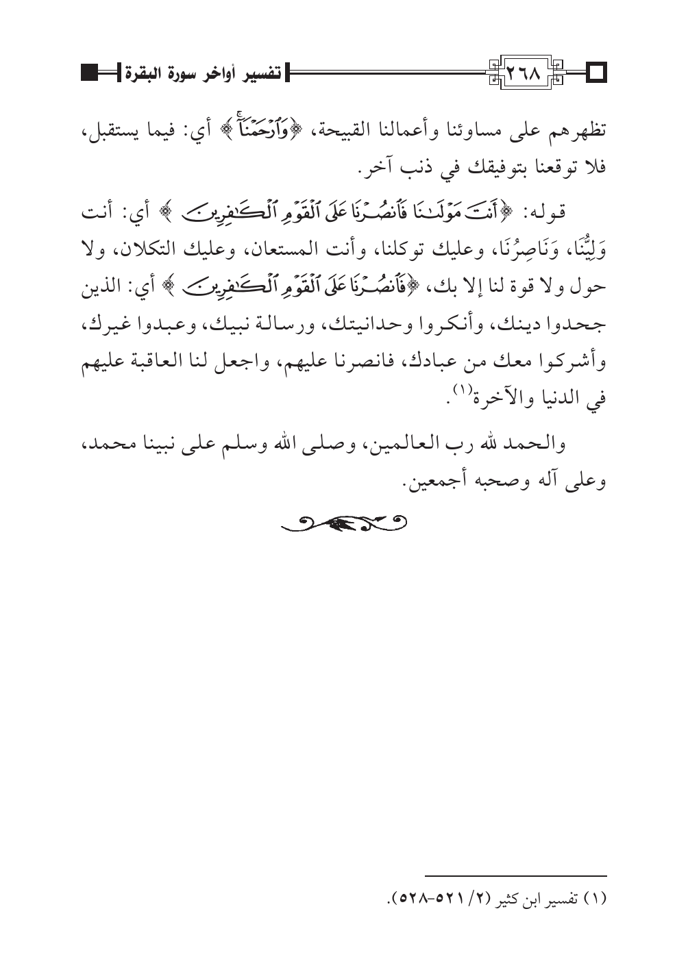 قوله: {أَنتَ مَوْلَانَا فَانصُرْنَا عَلَى الْقَوْمِ الْكَافِرِين} أي: أنت وَلِيُّنَا، وَنَاصِرُنَا، وعليك توكلنا، وأنت المستعان، وعليك التكلان، ولا حول ولا قوة لنا إلا بك، {فَانصُرْنَا عَلَى الْقَوْمِ الْكَافِرِين} أي: الذين جحدوا دينك، وأنكروا وحدانيتك، ورسالة نبيك، وعبدوا غيرك، وأشركوا معك من عبادك، فانصرنا عليهم، واجعل لنا العاقبة عليهم في الدنيا والآخرة (¬١).