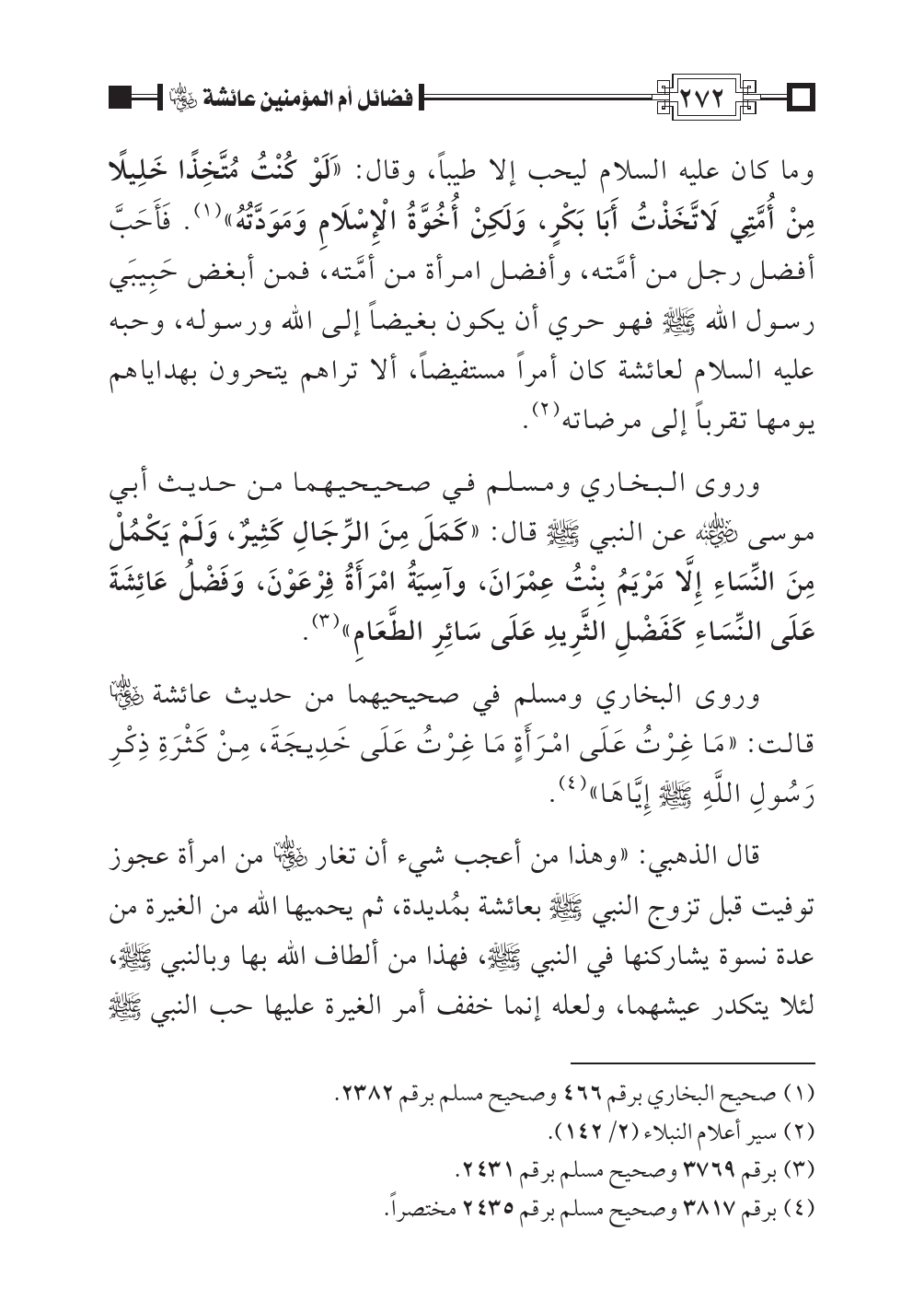وما كان عليه السلام ليحب إلا طيباً، وقال: «لَوْ كُنْتُ مُتَّخِذًا خَلِيلًا مِنْ أُمَّتِي لَاتَّخَذْتُ أَبَا بَكْرٍ، وَلَكِنْ أُخُوَّةُ الْإِسْلَامِ وَمَوَدَّتُهُ» (¬١). فَأَحَبَّ أفضل رجل من أمَّته، وأفضل امرأة من أمَّته، فمن أبغض حَبِيبَي رسول الله صلى اللهُ عليه وسلم فهو حري أن يكون بغيضاً إلى الله ورسوله، وحبه عليه السلام لعائشة كان أمراً مستفيضاً، ألا تراهم يتحرون بهداياهم يومها تقرباً إلى مرضاته (¬٢).