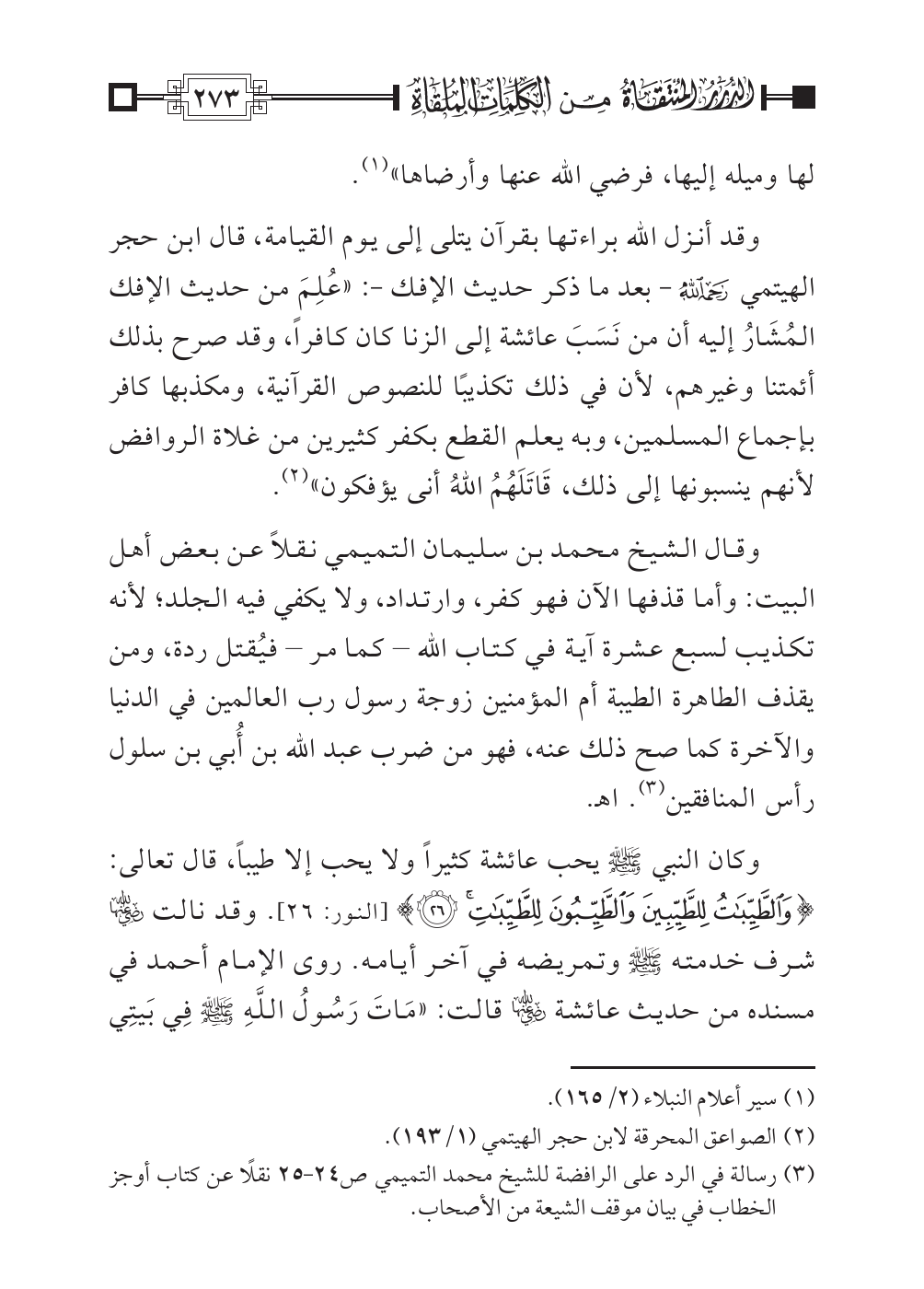وقال الشيخ محمد بن سليمان التميمي نقلاً عن بعض أهل البيت: وأما قذفها الآن فهو كفر، وارتداد، ولا يكفي فيه الجلد؛ لأنه تكذيب لسبع عشرة آية في كتاب الله - كما مر - فيُقتل ردة، ومن يقذف الطاهرة الطيبة أم المؤمنين زوجة رسول رب العالمين في الدنيا والآخرة كما صح ذلك عنه، فهو من ضرب عبد الله بن أُبي بن سلول رأس المنافقين (¬٣). اهـ.