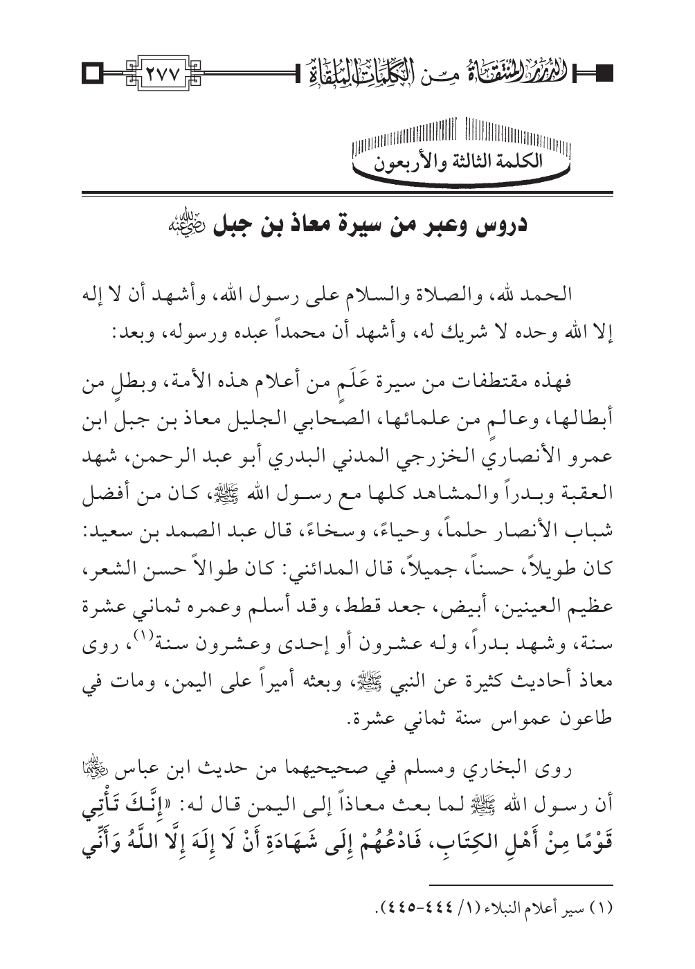 الكلمة الثالثة والأربعون: دروس وعبر من سيرة معاذ بن جبل - رضي الله عنه -
