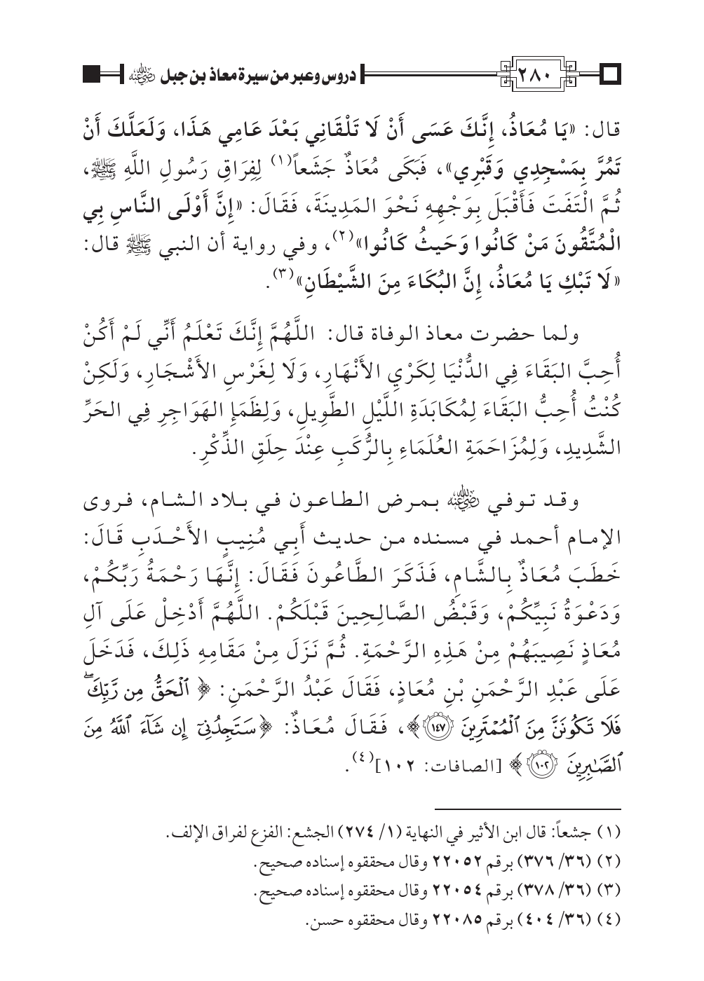 ولما حضرت معاذ الوفاة قال: اللَّهُمَّ إِنَّكَ تَعْلَمُ أَنِّي لَمْ أَكُنْ أُحِبَّ البَقَاءَ في الدُّنْيَا لِكَرْيِ الأَنْهَارِ، وَلَا لِغَرْسِ الأَشْجَارِ، وَلَكِنْ كُنْتُ أُحِبُّ البَقَاءَ لِمُكَابَدَةِ اللَّيْلِ الطَّوِيلِ، وَلِظَمَإِ الهَوَاجِرِ في الحَرِّ الشَّدِيدِ، وَلِمُزَاحَمَةِ العُلَمَاءِ بِالرُّكَبِ عِنْدَ حِلَقِ الذِّكْرِ.