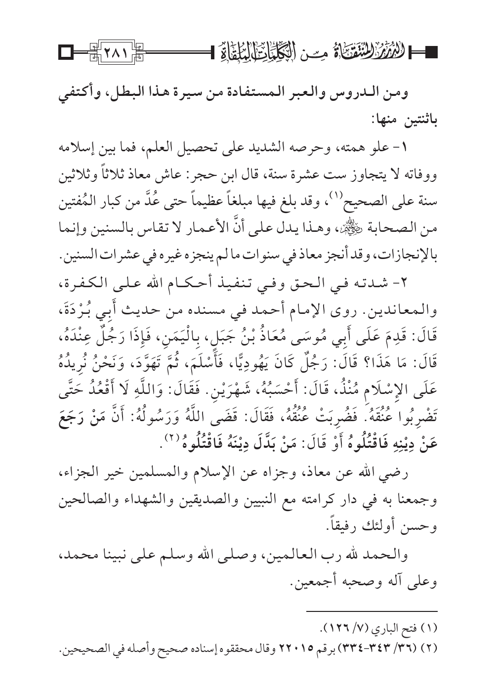 رضي الله عن معاذ، وجزاه عن الإِسلام والمسلمين خير الجزاء، وجمعنا به في دار كرامته مع النبيين والصديقين والشهداء والصالحين وحسن أولئك رفيقاً.