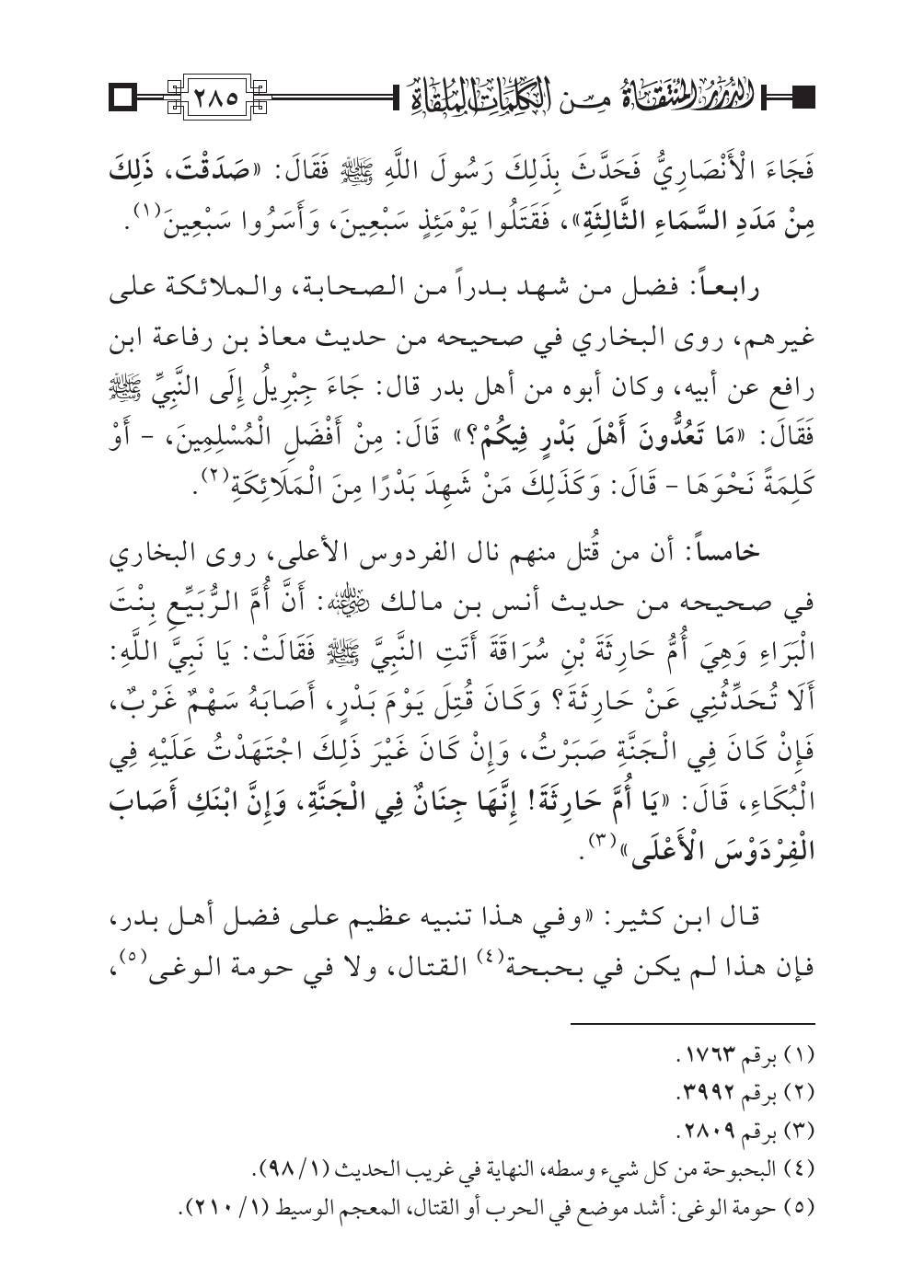 خامساً: أن من قُتل منهم نال الفردوس الأعلى، روى البخاري في صحيحه من حديث أنس بن مالك رضي اللهُ عنه: أَنَّ أُمَّ الرُّبَيِّعِ بِنْتَ الْبَرَاءِ وَهِيَ أُمُّ حَارِثَةَ بْنِ سُرَاقَةَ أَتَتِ النَّبِيَّ صلى اللهُ عليه وسلم فَقَالَتْ: يَا نَبِيَّ اللَّهِ: أَلَا تُحَدِّثُنِي عَنْ حَارِثَةَ؟ وَكَانَ قُتِلَ يَوْمَ بَدْرٍ، أَصَابَهُ سَهْمٌ غَرْبٌ، فَإِنْ كَانَ فِي الْجَنَّةِ صَبَرْتُ، وَإِنْ كَانَ غَيْرَ ذَلِكَ اجْتَهَدْتُ عَلَيْهِ فِي الْبُكَاءِ، قَالَ: «يَا أُمَّ حَارِثَةَ! إِنَّهَا جِنَانٌ فِي الْجَنَّةِ، وَإِنَّ ابْنَكِ أَصَابَ الْفِرْدَوْسَ الْأَعْلَى» (¬٣).