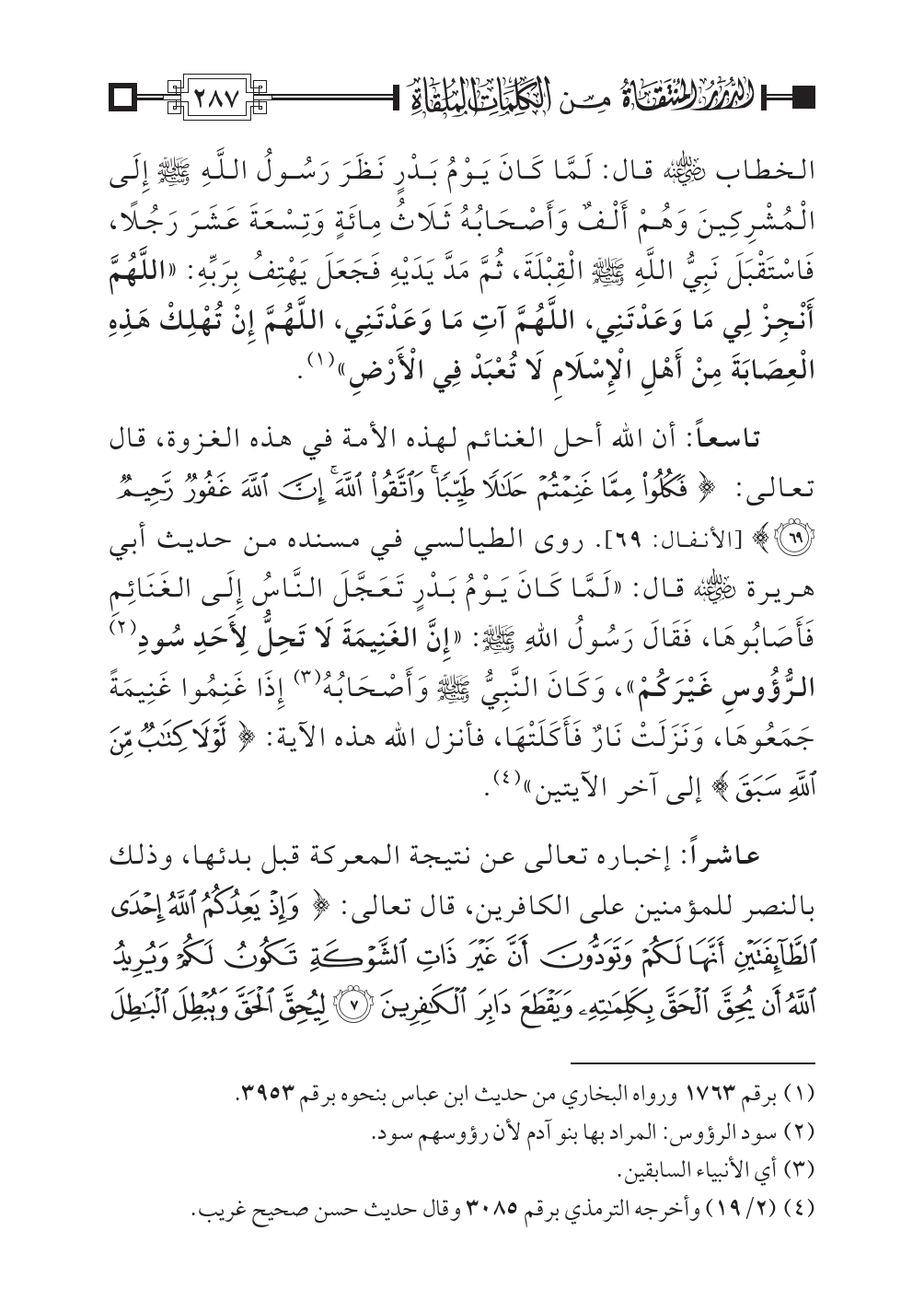تاسعاً: أن الله أحل الغنائم لهذه الأمة في هذه الغزوة، قال تعالى: {فَكُلُوا مِمَّا غَنِمْتُمْ حَلَالاً طَيِّبًا وَاتَّقُوا اللهَ إِنَّ اللهَ غَفُورٌ رَّحِيم (٦٩)} [الأنفال: ٦٩]. روى الطيالسي في مسنده من حديث أبي هريرة رضي اللهُ عنه قال: «لَمَّا كَانَ يَوْمُ بَدْرٍ تَعَجَّلَ النَّاسُ إِلَى الغَنَائِمِ فَأَصَابُوهَا، فَقَالَ رَسُولُ اللهِ صلى اللهُ عليه وسلم: «إِنَّ الغَنِيمَةَ لَا تَحِلُّ لِأَحَدِ سُودِ (¬٢) الرُّؤُوسِ غَيْرَكُمْ»، وَكَانَ النَّبِيُّ صلى اللهُ عليه وسلم وَأَصْحَابُهُ (¬٣) إِذَا غَنِمُوا غَنِيمَةً جَمَعُوهَا، وَنَزَلَتْ نَارٌ فَأَكَلَتْهَا، فأنزل الله هذه الآية: {لَّوْلَا كِتَابٌ مِّنَ اللهِ سَبَقَ} إلى آخر الآيتين» (¬٤).