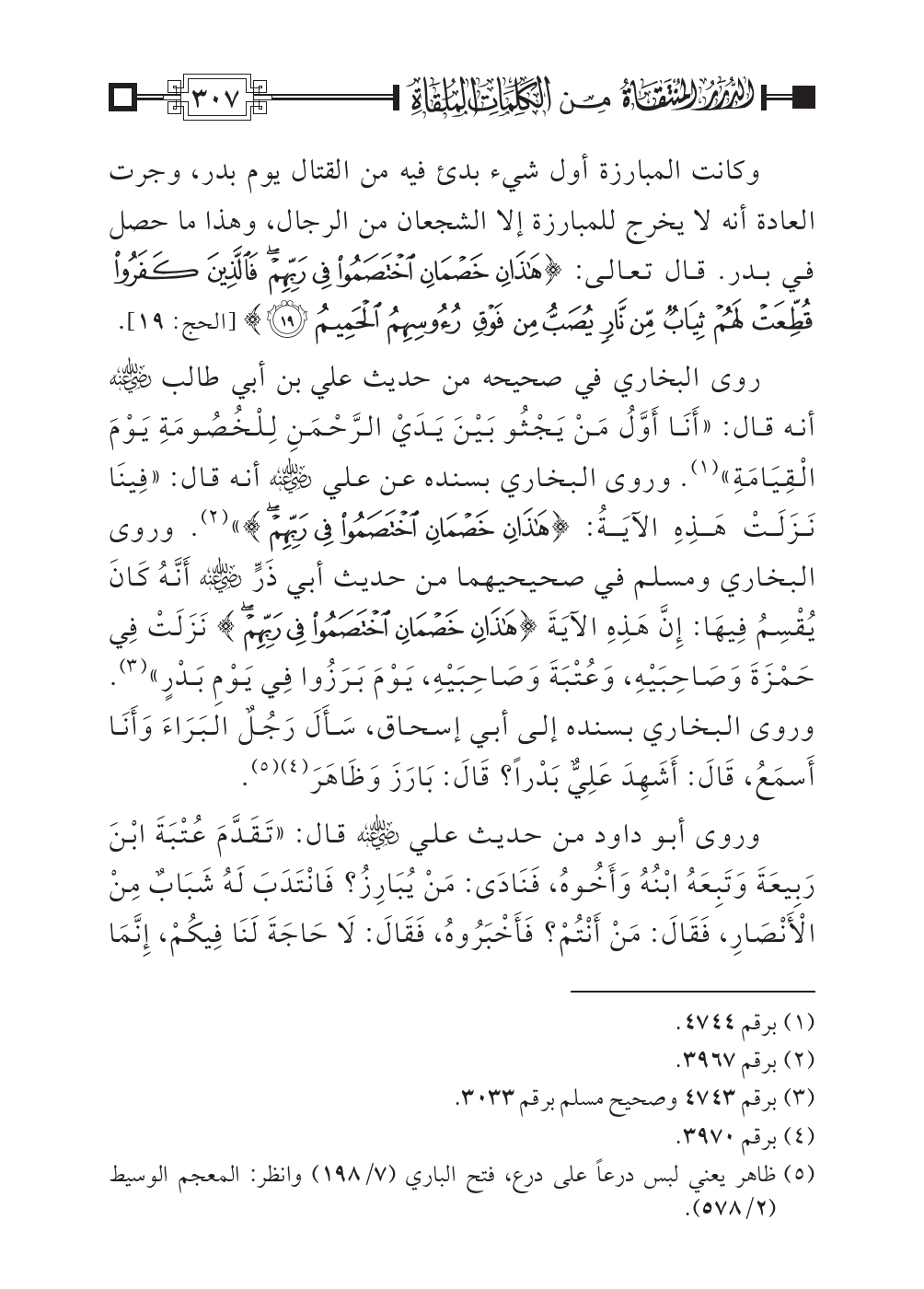 روى البخاري في صحيحه من حديث علي بن أبي طالب رضي اللهُ عنه أنه قال: «أَنَا أَوَّلُ مَنْ يَجْثُو بَيْنَ يَدَيْ الرَّحْمَنِ لِلْخُصُومَةِ يَوْمَ الْقِيَامَةِ» (¬١). وروى البخاري بسنده عن علي رضي اللهُ عنه أنه قال: «فِينَا نَزَلَتْ هَذِهِ الآيَةُ: {هَذَانِ خَصْمَانِ اخْتَصَمُوا فِي رَبِّهِمْ}» (¬٢). وروى البخاري ومسلم في صحيحيهما من حديث أبي ذَرٍّ رضي اللهُ عنه أَنَّهُ كَانَ يُقْسِمُ فِيهَا: إِنَّ هَذِهِ الآيَةَ {هَذَانِ خَصْمَانِ اخْتَصَمُوا فِي رَبِّهِمْ} نَزَلَتْ فِي حَمْزَةَ وَصَاحِبَيْهِ، وَعُتْبَةَ وَصَاحِبَيْهِ، يَوْمَ بَرَزُوا فِي يَوْمِ بَدْرٍ» (¬٣). وروى البخاري بسنده إلى أبي إسحاق، سَأَلَ رَجُلٌ البَرَاءَ وَأَنَا أَسمَعُ، قَالَ: أَشَهِدَ عَلِيٌّ بَدْراً؟ قَالَ: بَارَزَ وَظَاهَرَ (¬٤) (¬٥).