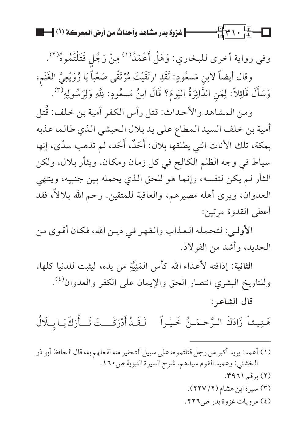 ومن المشاهد والأحداث: قتل رأس الكفر أمية بن خلف: قُتل أمية بن خلف السيد المطاع على يد بلال الحبشي الذي طالما عذبه بمكة، تلك الأنات التي يطلقها بلال: أَحَدٌ، أَحَد، لم تذهب سدًى، إنها سياط في وجه الظلم الكالح في كل زمان ومكان، ويثأر بلال، ولكن الثأر لم يكن لنفسه، وإنما هو للحق الذي يحمله بين جنبيه، وينتهي العدوان، ويرى أهله مصيرهم، والعاقبة للمتقين. رحم الله بلالاً، فقد أعطى القدوة مرتين: