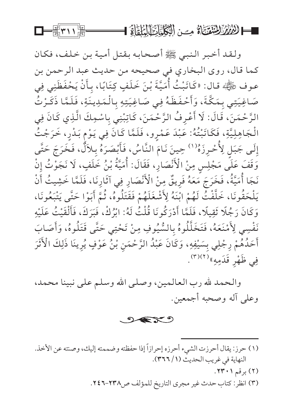 ولقد أخبر النبي صلى اللهُ عليه وسلم أصحابه بقتل أمية بن خلف، فكان كما قال، روى البخاري في صحيحه من حديث عبد الرحمن بن عوف رضي اللهُ عنه قال: «كَاتَبْتُ أُمَيَّةَ بْنَ خَلَفٍ كِتَابًا، بِأَنْ يَحْفَظَنِي فِي صَاغِيَتِي بِمَكَّةَ، وَأَحْفَظَهُ فِي صَاغِيَتِهِ بِالْمَدِينَةِ، فَلَمَّا ذَكَرْتُ الرَّحْمَنَ، قَالَ: لَا أَعْرِفُ الرَّحْمَنَ، كَاتِبْنِي بِاسْمِكَ الَّذِي كَانَ فِي الْجَاهِلِيَّةِ، فَكَاتَبْتُهُ: عَبْدَ عَمْرٍو، فَلَمَّا كَانَ فِي يَوْمِ بَدْرٍ، خَرَجْتُ إِلَى جَبَلٍ لِأُحْرِزَهُ (¬١) حِينَ نَامَ النَّاسُ، فَأَبْصَرَهُ بِلَالٌ، فَخَرَجَ حَتَّى وَقَفَ عَلَى مَجْلِسٍ مِنْ الْأَنْصَارِ، فَقَالَ: أُمَيَّةُ بْنُ خَلَفٍ، لَا نَجَوْتُ إِنْ نَجَا أُمَيَّةُ، فَخَرَجَ مَعَهُ فَرِيقٌ مِنْ الْأَنْصَارِ فِي آثَارِنَا، فَلَمَّا خَشِيتُ أَنْ يَلْحَقُونَا، خَلَّفْتُ لَهُمْ ابْنَهُ لِأَشْغَلَهُمْ فَقَتَلُوهُ، ثُمَّ أَبَوْا حَتَّى يَتْبَعُونَا، وَكَانَ رَجُلًا ثَقِيلًا، فَلَمَّا أَدْرَكُونَا قُلْتُ لَهُ: ابْرُكْ، فَبَرَكَ، فَأَلْقَيْتُ عَلَيْهِ نَفْسِي لِأَمْنَعَهُ، فَتَخَلَّلُوهُ بِالسُّيُوفِ مِنْ تَحْتِي حَتَّى قَتَلُوهُ، وَأَصَابَ أَحَدُهُمْ رِجْلِي بِسَيْفِهِ، وَكَانَ عَبْدُ الرَّحْمَنِ بْنُ عَوْفٍ يُرِينَا ذَلِكَ الْأَثَرَ فِي ظَهْرِ قَدَمِهِ» (¬٢) (¬٣).