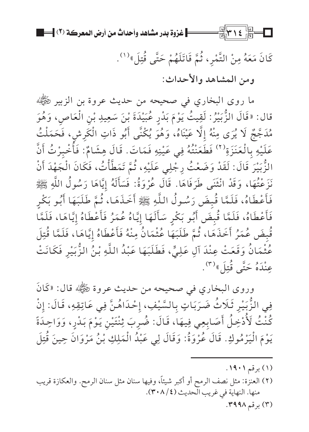 ما روى البخاري في صحيحه من حديث عروة بن الزبير رضي اللهُ عنه قال: «قَالَ الزُّبَيْرُ: لَقِيتُ يَوْمَ بَدْرٍ عُبَيْدَةَ بْنَ سَعِيدِ بْنِ الْعَاصِ، وَهُوَ مُدَجَّجٌ لَا يُرَى مِنْهُ إِلَّا عَيْنَاهُ، وَهُوَ يُكْنَّى أَبُو ذَاتِ الْكَرِشِ، فَحَمَلْتُ عَلَيْهِ بِالْعَنَزَةِ (¬٢) فَطَعَنْتُهُ فِي عَيْنِهِ فَمَاتَ. قَالَ هِشَامٌ: فَأُخْبِرْتُ أَنَّ الزُّبَيْرَ قَالَ: لَقَدْ وَضَعْتُ رِجْلِي عَلَيْهِ، ثُمَّ تَمَطَّاتُ، فَكَانَ الْجَهْدَ أَنْ نَزَعْتُهَا، وَقَدْ انْثَنَى طَرَفَاهَا. قَالَ عُرْوَةُ: فَسَأَلَهُ إِيَّاهَا رَسُولُ اللَّهِ صلى اللهُ عليه وسلم فَأَعْطَاهُ، فَلَمَّا قُبِضَ رَسُولُ اللَّهِ صلى اللهُ عليه وسلم أَخَذَهَا، ثُمَّ طَلَبَهَا أَبُو بَكْرٍ فَأَعْطَاهُ، فَلَمَّا قُبِضَ أَبُو بَكْرٍ سَأَلَهَا إِيَّاهُ عُمَرُ فَأَعْطَاهُ إِيَّاهَا، فَلَمَّا قُبِضَ عُمَرُ أَخَذَهَا، ثُمَّ طَلَبَهَا عُثْمَانُ مِنْهُ فَأَعْطَاهُ إِيَّاهَا، فَلَمَّا قُتِلَ عُثْمَانُ وَقَعَتْ عِنْدَ آلِ عَلِيٍّ، فَطَلَبَهَا عَبْدُ اللَّهِ بْنُ الزُّبَيْرِ فَكَانَتْ عِنْدَهُ حَتَّى قُتِلَ» (¬٣).