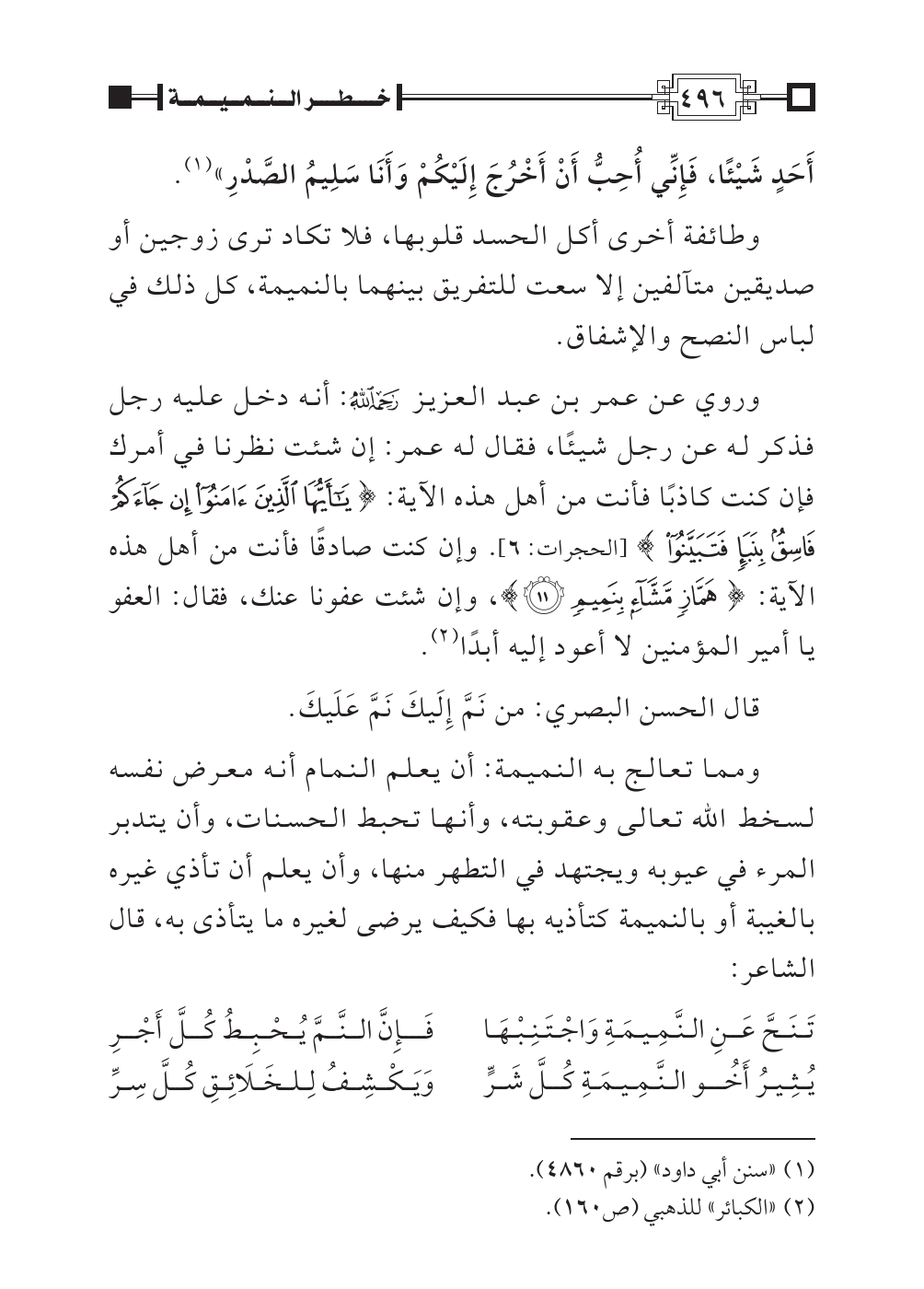 وروي عن عمر بن عبد العزيز رحمه الله: أنه دخل عليه رجل فذكر له عن رجل شيئًا، فقال له عمر: إن شئت نظرنا في أمرك فإن كنت كاذبًا فأنت من أهل هذه الآية: {يَاأَيُّهَا الَّذِينَ آمَنُوا إِن جَاءكُمْ فَاسِقٌ بِنَبَأٍ فَتَبَيَّنُوا} [الحجرات: ٦]. وإن كنت صادقًا فأنت من أهل هذه الآية: {هَمَّازٍ مَّشَّاء بِنَمِيم (١١)}، وإن شئت عفونا عنك، فقال: العفو يا أمير المؤمنين لا أعود إليه أبدًا (¬٢).
