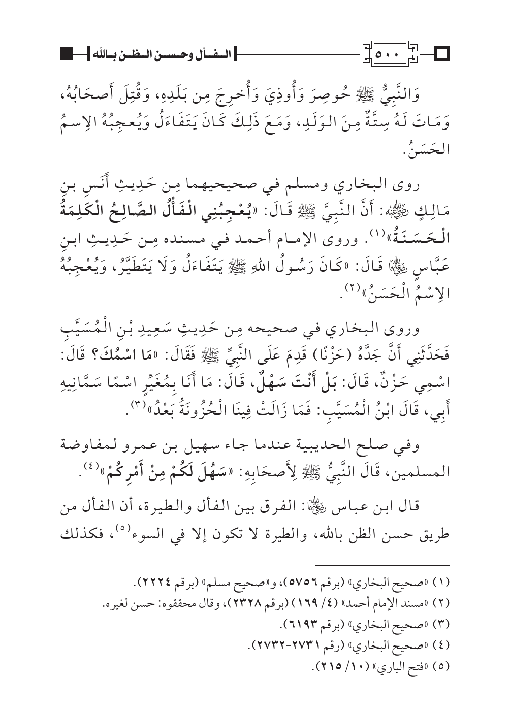 روى البخاري ومسلم في صحيحيهما مِن حَدِيثِ أَنَسِ بنِ مَالِكٍ رضي اللهُ عنه: أَنَّ النَّبِيَّ صلى اللهُ عليه وسلم قَالَ: «يُعْجِبُنِي الْفَالُ الصَّالِحُ الْكَلِمَةُ الْحَسَنَةُ» (¬١). وروى الإمام أحمد في مسنده مِن حَدِيثِ ابنِ عَبَّاسٍ رضي اللهُ عنهما قَالَ: «كَانَ رَسُولُ اللهِ صلى اللهُ عليه وسلم يَتَفَاءَلُ وَلَا يَتَطَيَّرُ، وَيُعْجِبُهُ الاِسْمُ الْحَسَنُ» (¬٢).