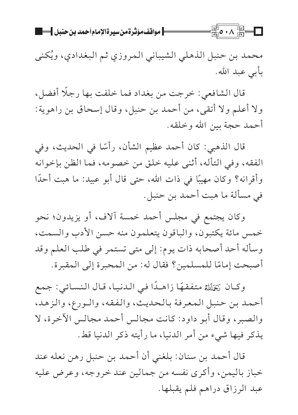وكان رحمه الله متفقهًا زاهدًا في الدنيا، قال النسائي: جمع أحمد بن حنبل المعرفة بالحديث، والفقه، والورع، والزهد، والصبر، وقال أبو داود: كانت مجالس أحمد مجالس الآخرة، لا يذكر فيها شيء من أمر الدنيا، ما رأيته ذكر الدنيا قط.