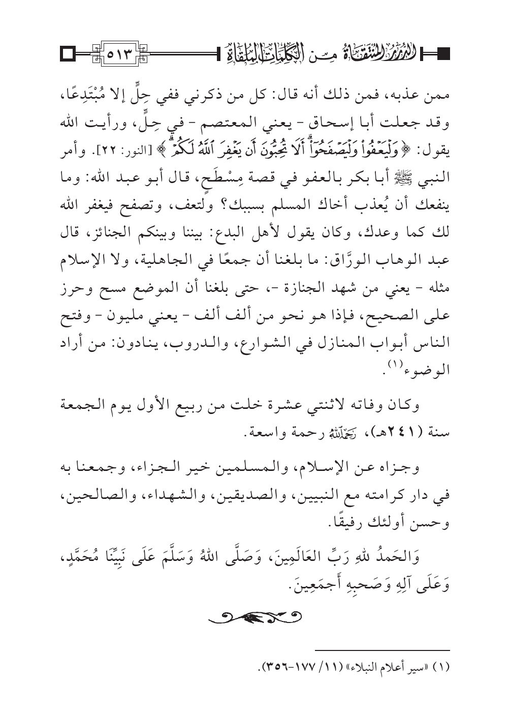 ممن عذبه، فمن ذلك أنه قال: كل من ذكرني ففي حِلٍّ إلا مُبْتَدِعًا، وقد جعلت أبا إسحاق - يعني المعتصم - في حِلٍّ، ورأيت الله يقول: {وَلْيَعْفُوا وَلْيَصْفَحُوا أَلَا تُحِبُّونَ أَن يَغْفِرَ اللَّهُ لَكُمْ} [النور: ٢٢]. وأمر النبي صلى اللهُ عليه وسلم أبا بكر بالعفو في قصة مِسْطَحٍ، قال أبو عبد الله: وما ينفعك أن يُعذب أخاك المسلم بسببك؟ ولتعف، وتصفح فيغفر الله لك كما وعدك، وكان يقول لأهل البدع: بيننا وبينكم الجنائز، قال عبد الوهاب الورَّاق: ما بلغنا أن جمعًا في الجاهلية، ولا الإسلام مثله - يعني من شهد الجنازة -، حتى بلغنا أن الموضع مسح وحرز على الصحيح، فإذا هو نحو من ألف ألف - يعني مليون - وفتح الناس أبواب المنازل في الشوارع، والدروب، ينادون: من أراد الوضوء (¬١).