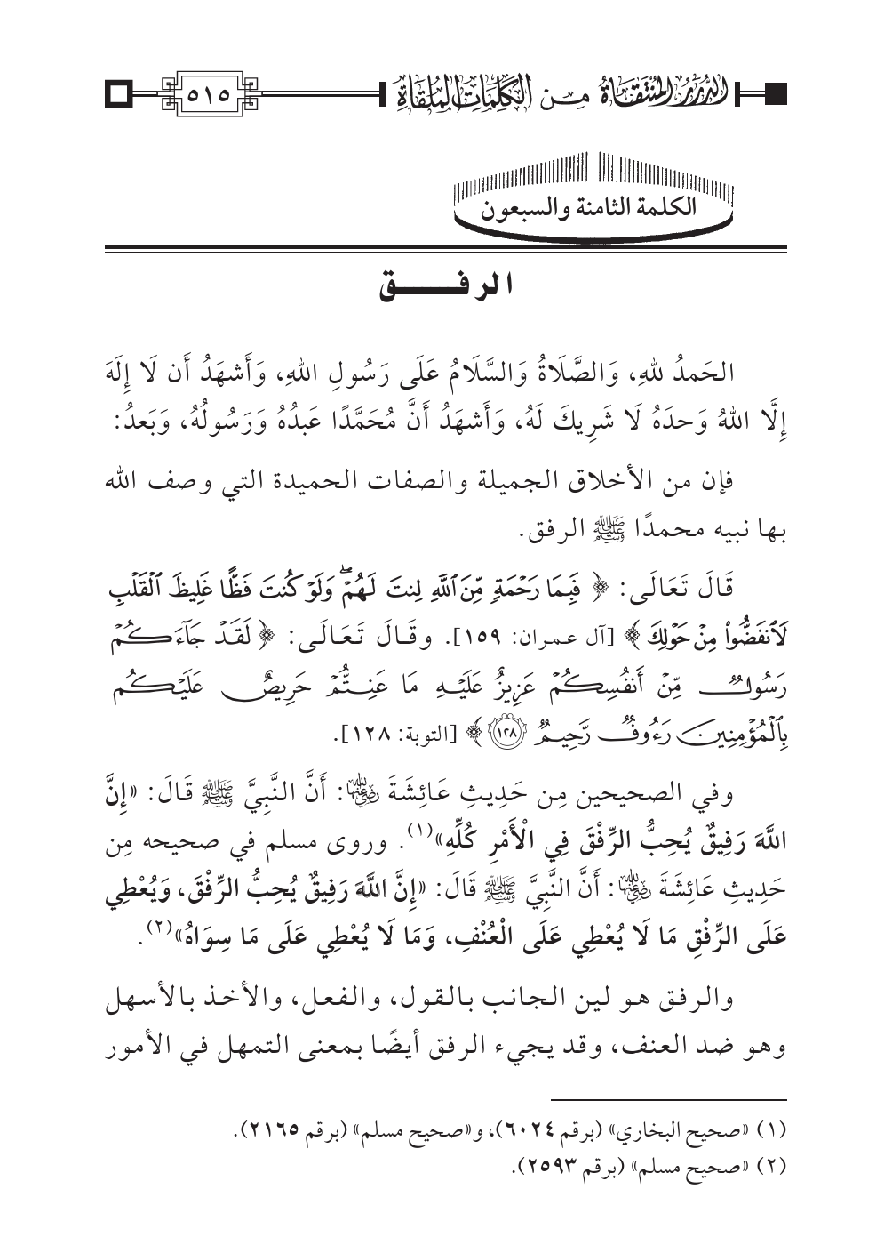 فإن من الأخلاق الجميلة والصفات الحميدة التي وصف الله بها نبيه محمدًا صلى اللهُ عليه وسلم الرفق.