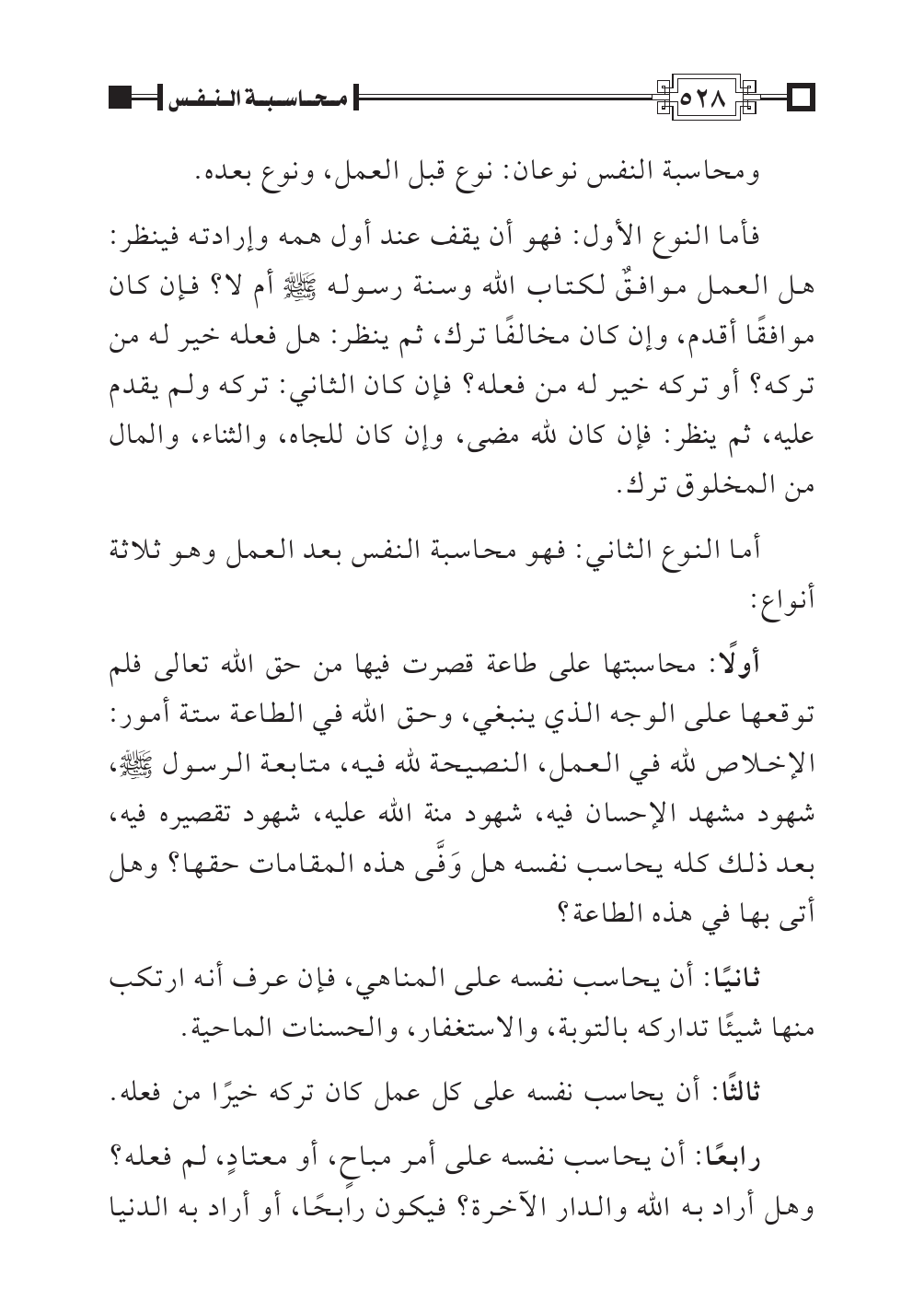 ومحاسبة النفس نوعان: نوع قبل العمل، ونوع بعده.