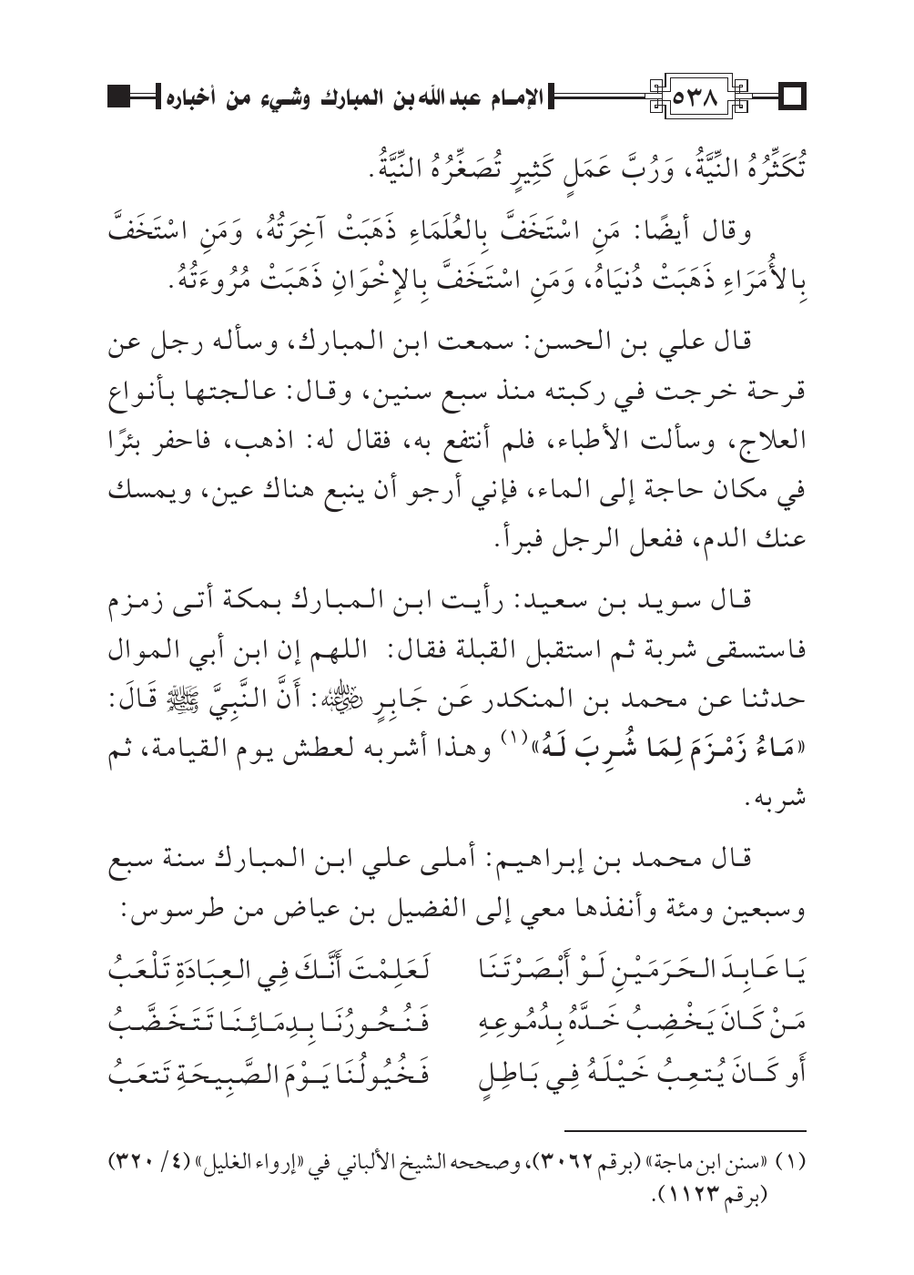 قال سويد بن سعيد: رأيت ابن المبارك بمكة أتى زمزم فاستسقى شربة ثم استقبل القبلة فقال: اللهم إن ابن أبي الموال حدثنا عن محمد بن المنكدر عَن جَابِرٍ رضي اللهُ عنه: أَنَّ النَّبِيَّ صلى اللهُ عليه وسلم قَالَ: «مَاءُ زَمْزَمَ لِمَا شُرِبَ لَهُ» (¬١) وهذا أشربه لعطش يوم القيامة، ثم شربه.