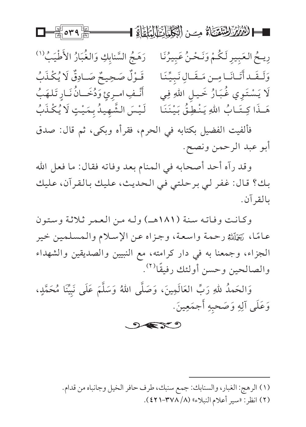 فألفيت الفضيل بكتابه في الحرم، فقرأه وبكى، ثم قال: صدق أبو عبد الرحمن ونصح.