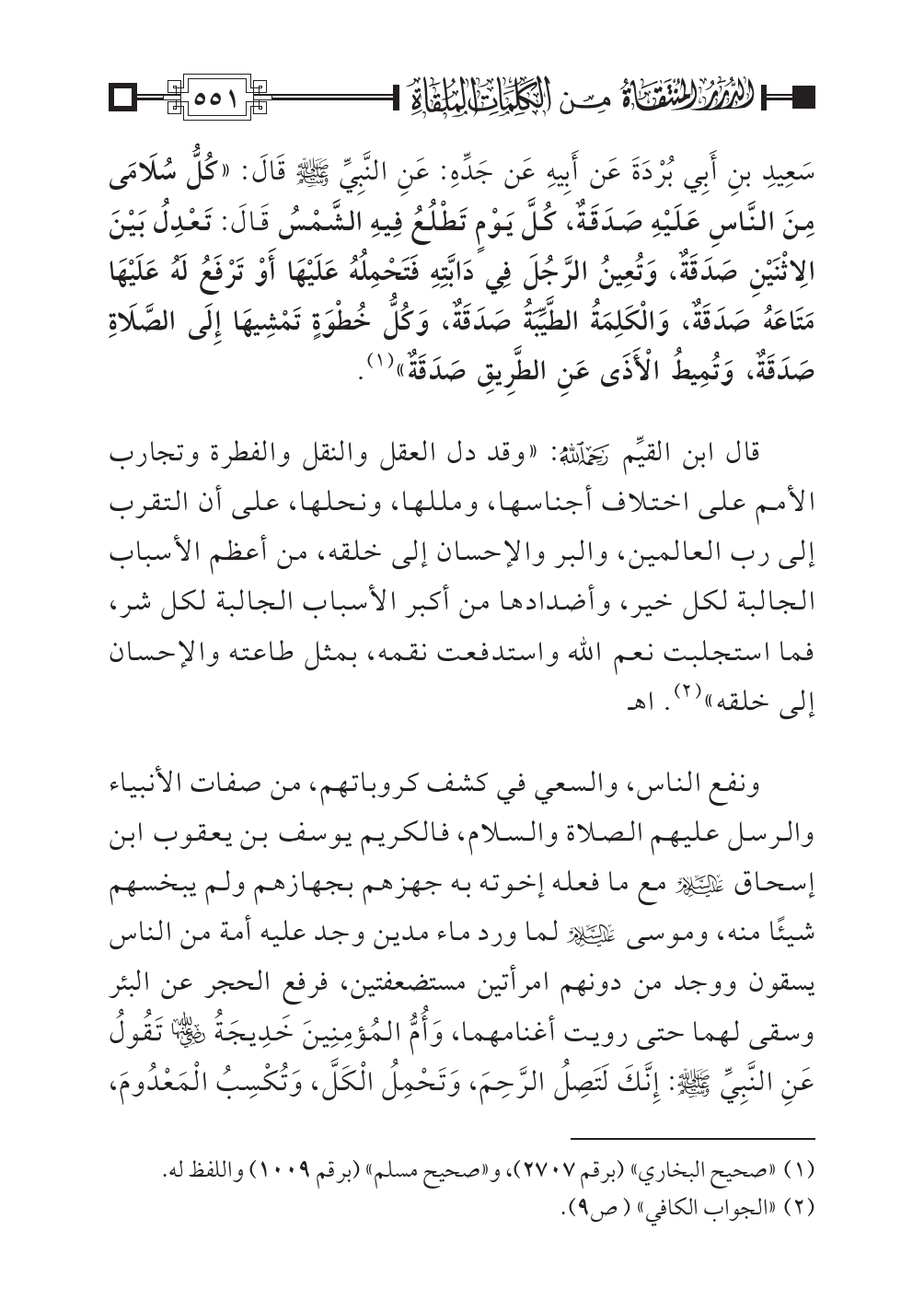 سَعِيدِ بنِ أَبِي بُرْدَةَ عَن أَبِيهِ عَن جَدِّهِ: عَنِ النَّبِيِّ صلى اللهُ عليه وسلم قَالَ: «كُلُّ سُلَامَى مِنَ النَّاسِ عَلَيْهِ صَدَقَةٌ، كُلَّ يَوْمٍ تَطْلُعُ فِيهِ الشَّمْسُ قَالَ: تَعْدِلُ بَيْنَ الِاثْنَيْنِ صَدَقَةٌ، وَتُعِينُ الرَّجُلَ فِي دَابَّتِهِ فَتَحْمِلُهُ عَلَيْهَا أَوْ تَرْفَعُ لَهُ عَلَيْهَا مَتَاعَهُ صَدَقَةٌ، وَالْكَلِمَةُ الطَّيِّبَةُ صَدَقَةٌ، وَكُلُّ خُطْوَةٍ تَمْشِيهَا إِلَى الصَّلَاةِ صَدَقَةٌ، وَتُمِيطُ الْأَذَى عَنِ الطَّرِيقِ صَدَقَةٌ» (¬١).