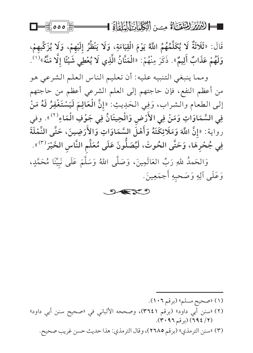 قَالَ: «ثَلَاثَةٌ لَا يُكَلِّمُهُمُ اللَّهُ يَوْمَ الْقِيَامَةِ، وَلَا يَنْظُرُ إِلَيْهِمْ، وَلَا يُزَكِّيهِمْ، وَلَهُمْ عَذَابٌ أَلِيمٌ». ذَكَرَ مِنْهُمْ: «الْمَنَّانُ الَّذِي لَا يُعْطِي شَيْئًا إِلَّا مَنَّهُ» (¬١).