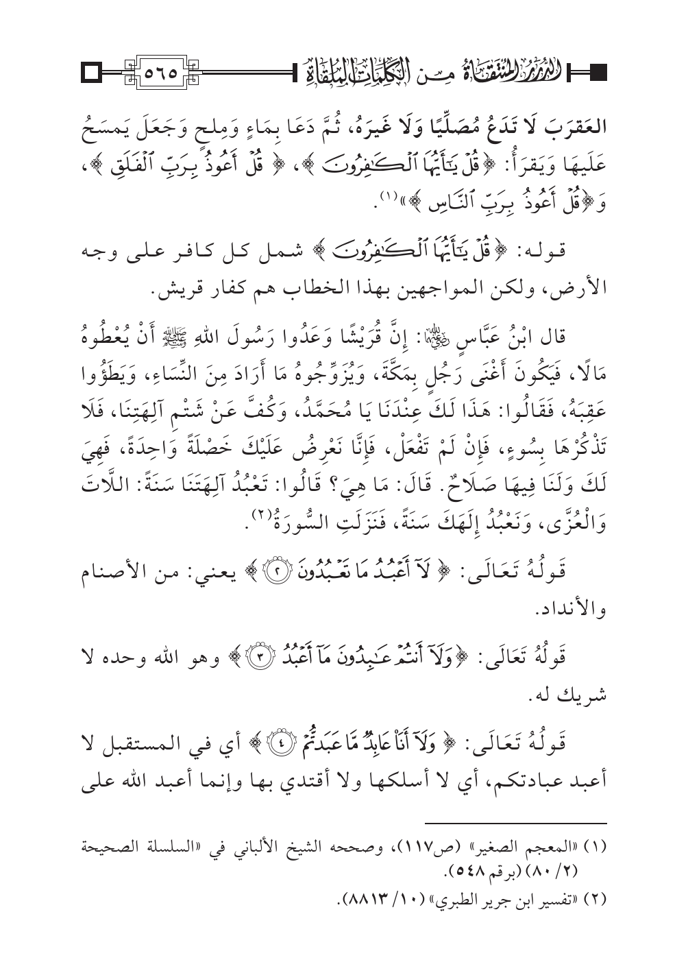 العَقرَبَ لَا تَدَعُ مُصَلِّيًا وَلَا غَيرَهُ، ثُمَّ دَعَا بِمَاءٍ وَمِلحٍ وَجَعَلَ يَمسَحُ عَلَيهَا وَيَقرَأُ: {قُلْ يَاأَيُّهَا الْكَافِرُون} {قُلْ أَعُوذُ بِرَبِّ الْفَلَق}، وَ {قُلْ أَعُوذُ بِرَبِّ النَّاس}» (¬١).