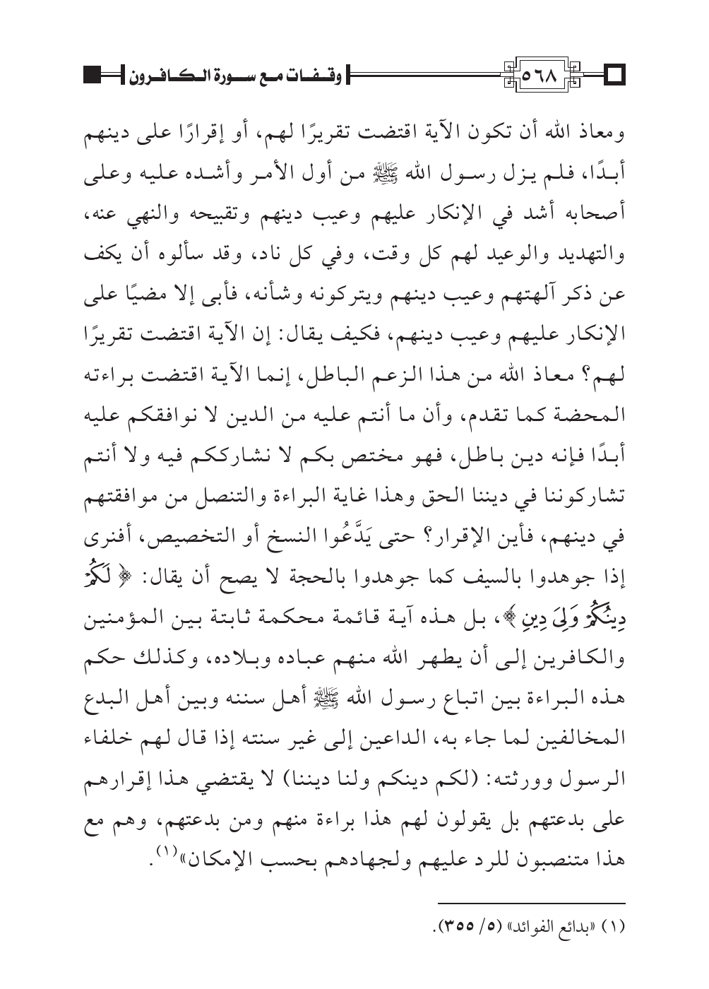 ومعاذ الله أن تكون الآية اقتضت تقريرًا لهم، أو إقرارًا على دينهم أبدًا، فلم يزل رسول الله صلى اللهُ عليه وسلم من أول الأمر وأشده عليه وعلى أصحابه أشد في الإنكار عليهم وعيب دينهم وتقبيحه والنهي عنه، والتهديد والوعيد لهم كل وقت، وفي كل ناد، وقد سألوه أن يكف عن ذكر آلهتهم وعيب دينهم ويتركونه وشأنه، فأبى إلا مضيًا على الإنكار عليهم وعيب دينهم، فكيف يقال: إن الآية اقتضت تقريرًا لهم؟ معاذ الله من هذا الزعم الباطل، إنما الآية اقتضت براءته المحضة كما تقدم، وأن ما أنتم عليه من الدين لا نوافقكم عليه أبدًا فإنه دين باطل، فهو مختص بكم لا نشارككم فيه ولا أنتم تشاركوننا في ديننا الحق وهذا غاية البراءة والتنصل من موافقتهم في دينهم، فأين الإقرار؟ حتى يَدَّعُوا النسخ أو التخصيص، أفنرى إذا جوهدوا بالسيف كما جوهدوا بالحجة لا يصح أن يقال: {لَكُمْ دِينُكُمْ وَلِيَ دِين}، بل هذه آية قائمة محكمة ثابتة بين المؤمنين والكافرين إلى أن يطهر الله منهم عباده وبلاده، وكذلك حكم هذه البراءة بين اتباع رسول الله صلى اللهُ عليه وسلم أهل سننه وبين أهل البدع المخالفين لما جاء به، الداعين إلى غير سنته إذا قال لهم خلفاء الرسول وورثته: (لكم دينكم ولنا ديننا) لا يقتضي هذا إقرارهم على بدعتهم بل يقولون لهم هذا براءة منهم ومن بدعتهم، وهم مع هذا متنصبون للرد عليهم ولجهادهم بحسب الإمكان» (¬١).