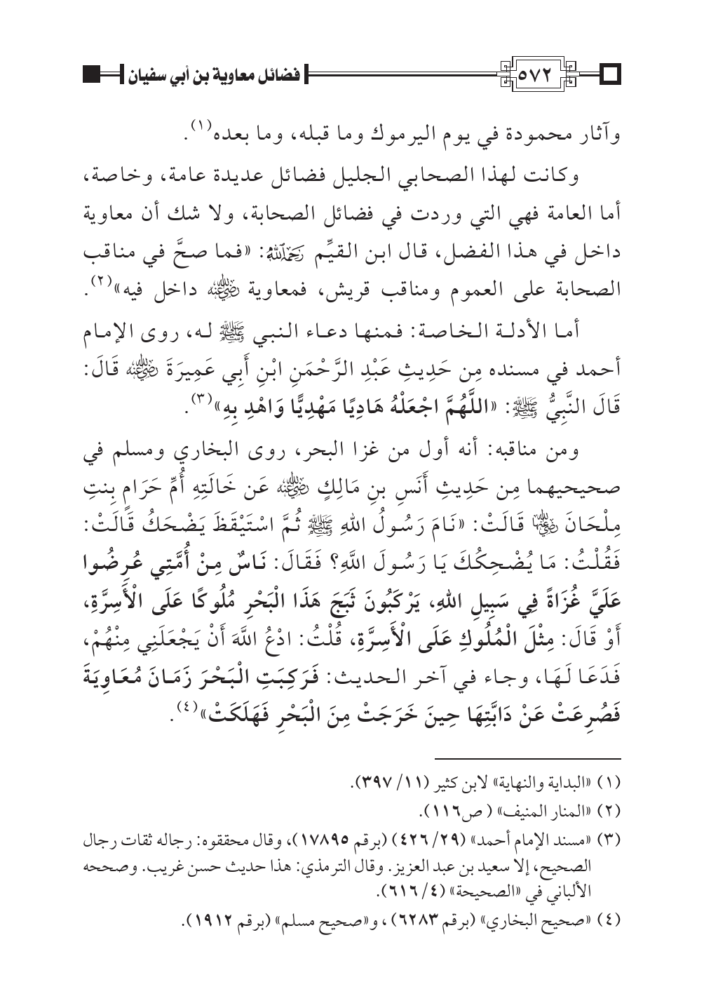 وكانت لهذا الصحابي الجليل فضائل عديدة عامة، وخاصة، أما العامة فهي التي وردت في فضائل الصحابة، ولا شك أن معاوية داخل في هذا الفضل، قال ابن القيِّم رحمه الله: «فما صحَّ في مناقب الصحابة على العموم ومناقب قريش، فمعاوية رضي اللهُ عنه داخل فيه» (¬٢).